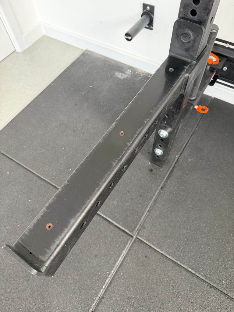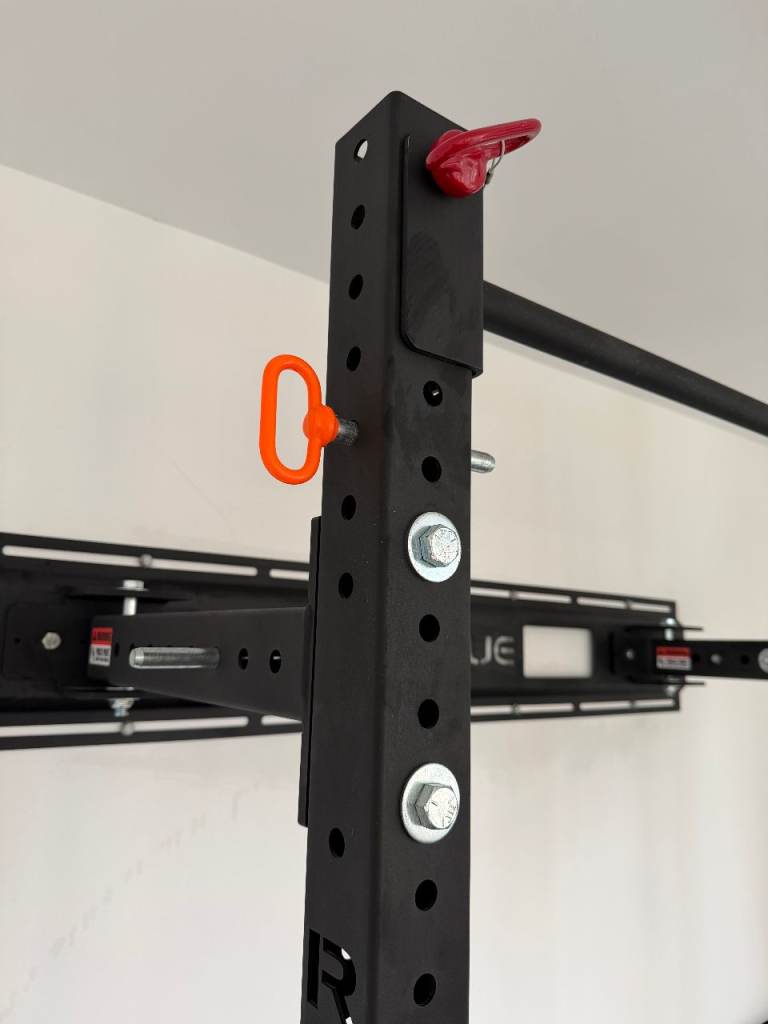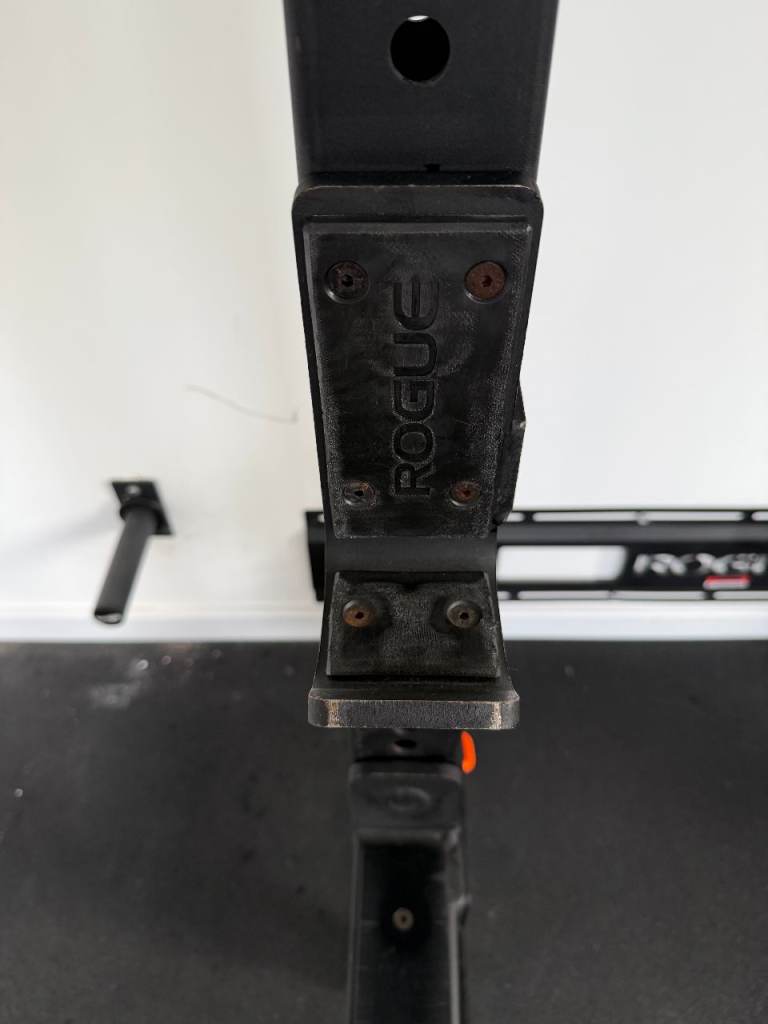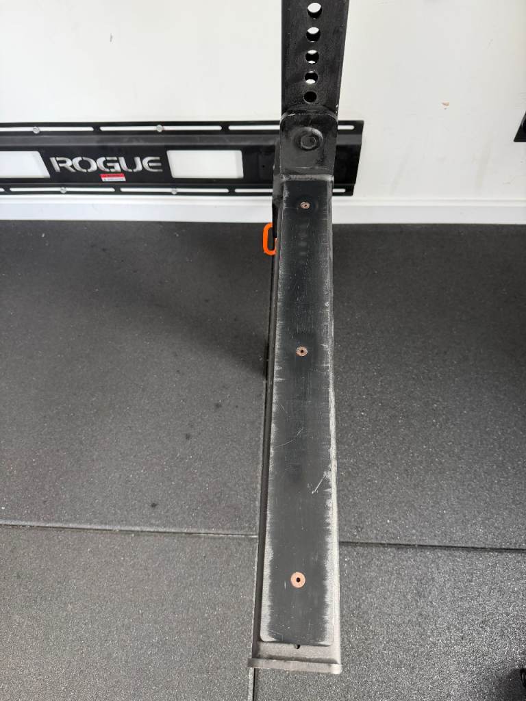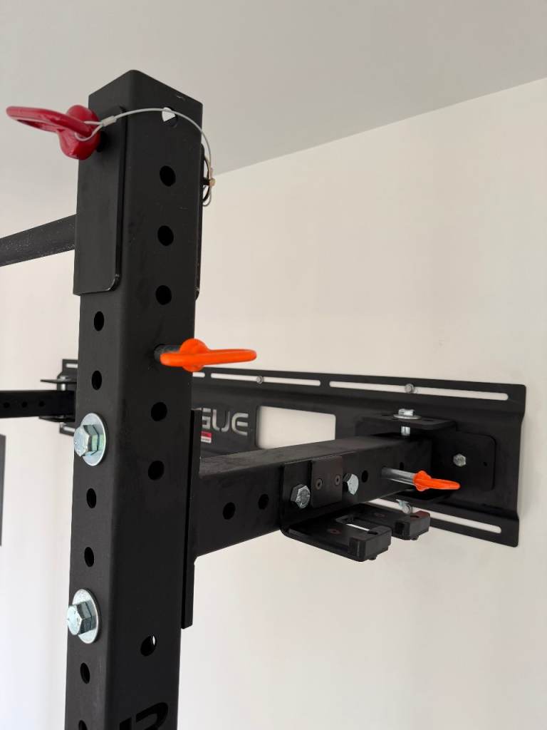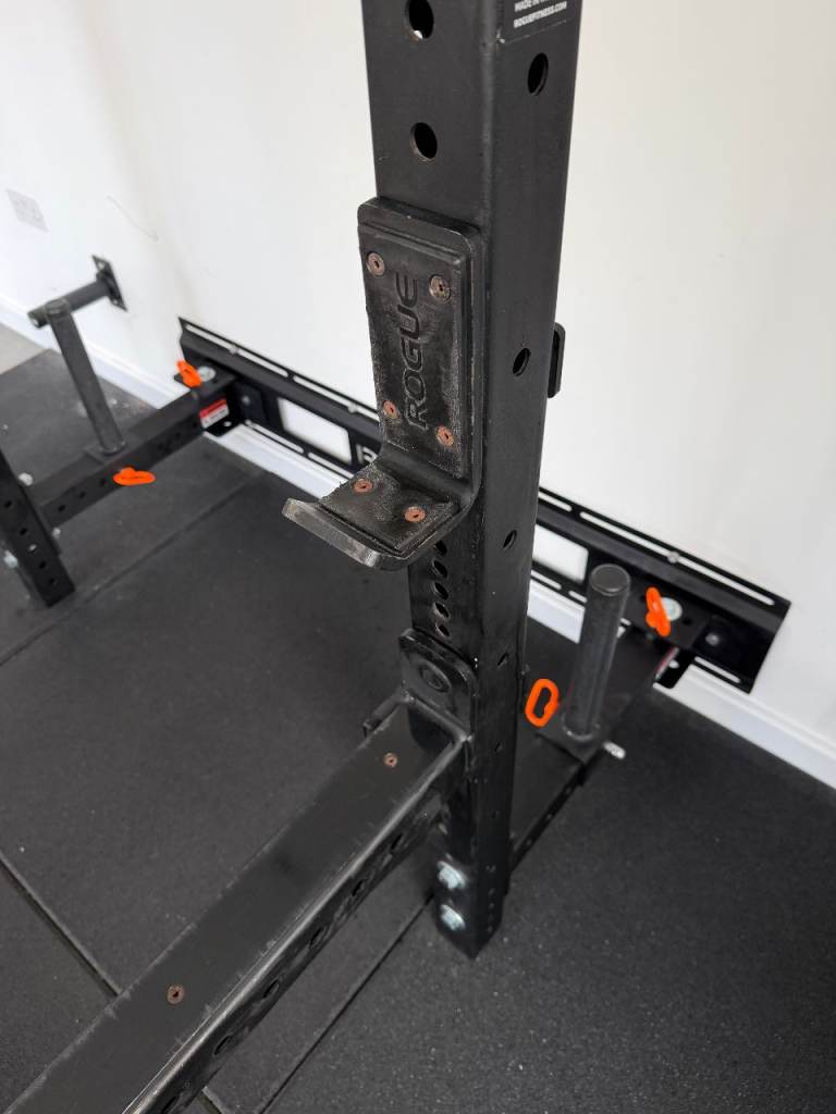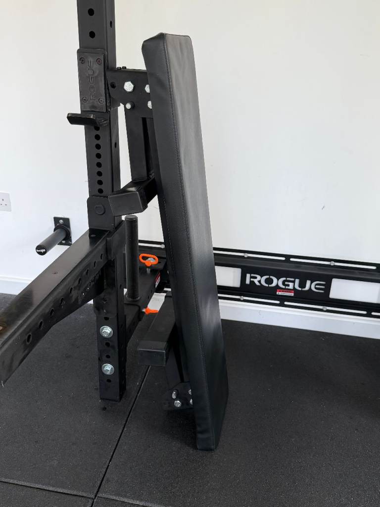 Rogue Fitness Monster Lite wall-mounted folding rack (RML-3W, 21.5” depth) with Rogue stringers, safety spotter arms, plate storage channels and bar hanger. All originally purchased new from Rogue UK. Used 3.5 years in a home gym in Richmond (indoors only).