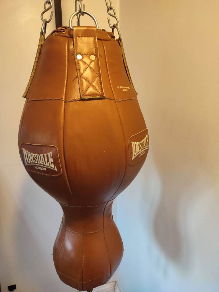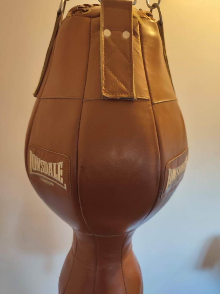 Vintage Style Lonsdale 3ft Uppercut Punchbag. Only had 6 months of use and in good condition. Cow hide classic brown leather material. Includes 4 hook chain and strong wall bracket (as seen in photo). Bag Weight approx 23kg.