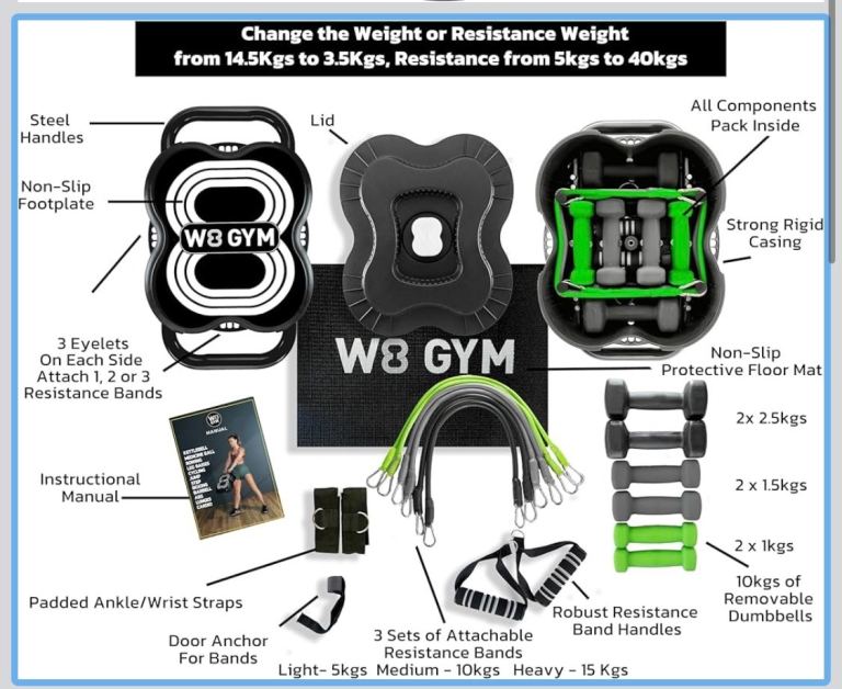 CHANGE the WEIGHT or RESISTANCE NOT the Equipment: The W8 GYM has 10KGS of REMOVABLE Dumbbells (2x 2.5KG Black, 2x 1.5KG Grey, 2x 1KG Coloured) FREE Workout Videos