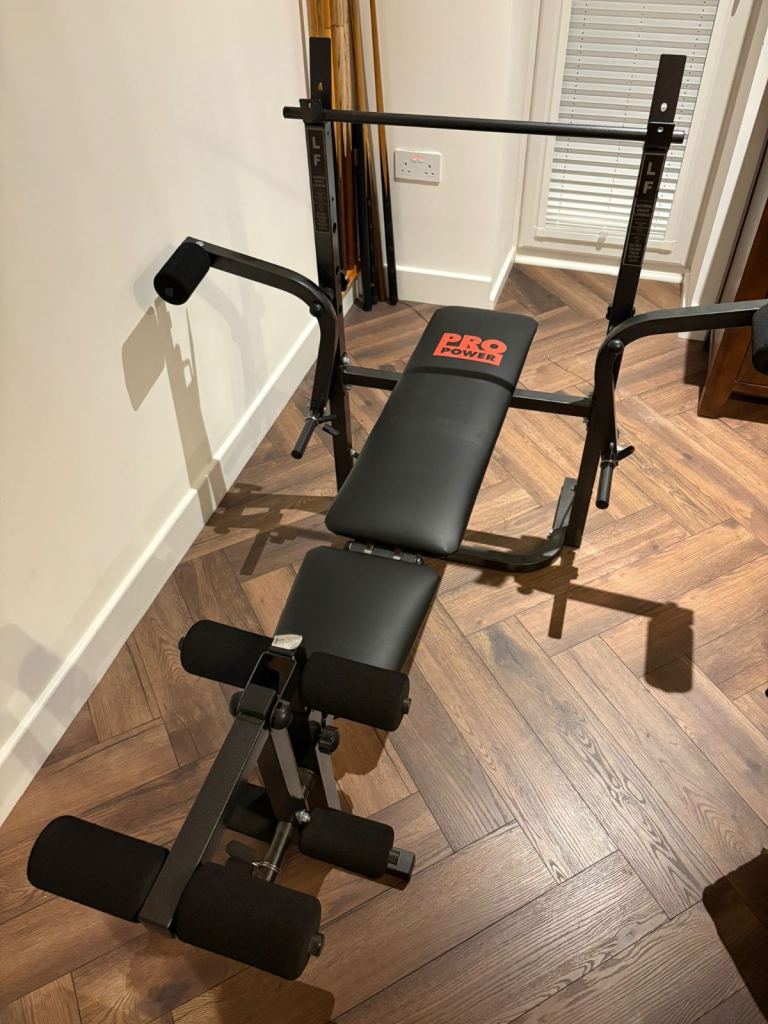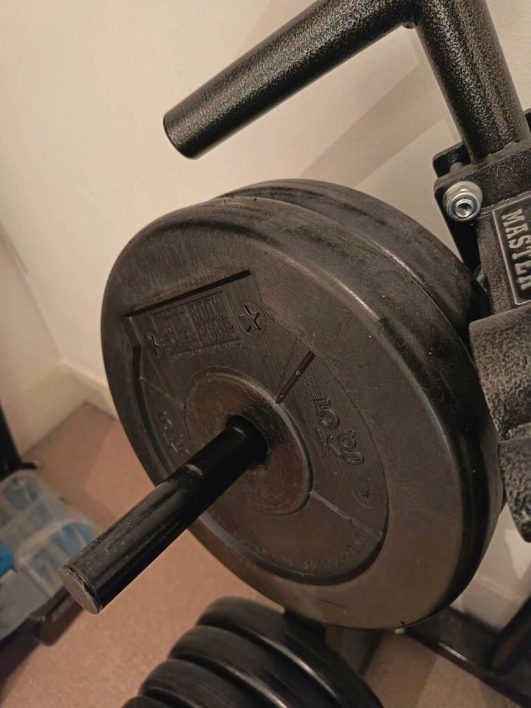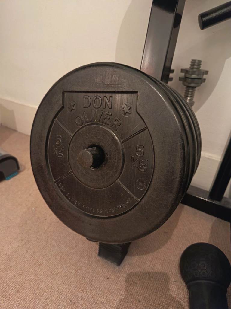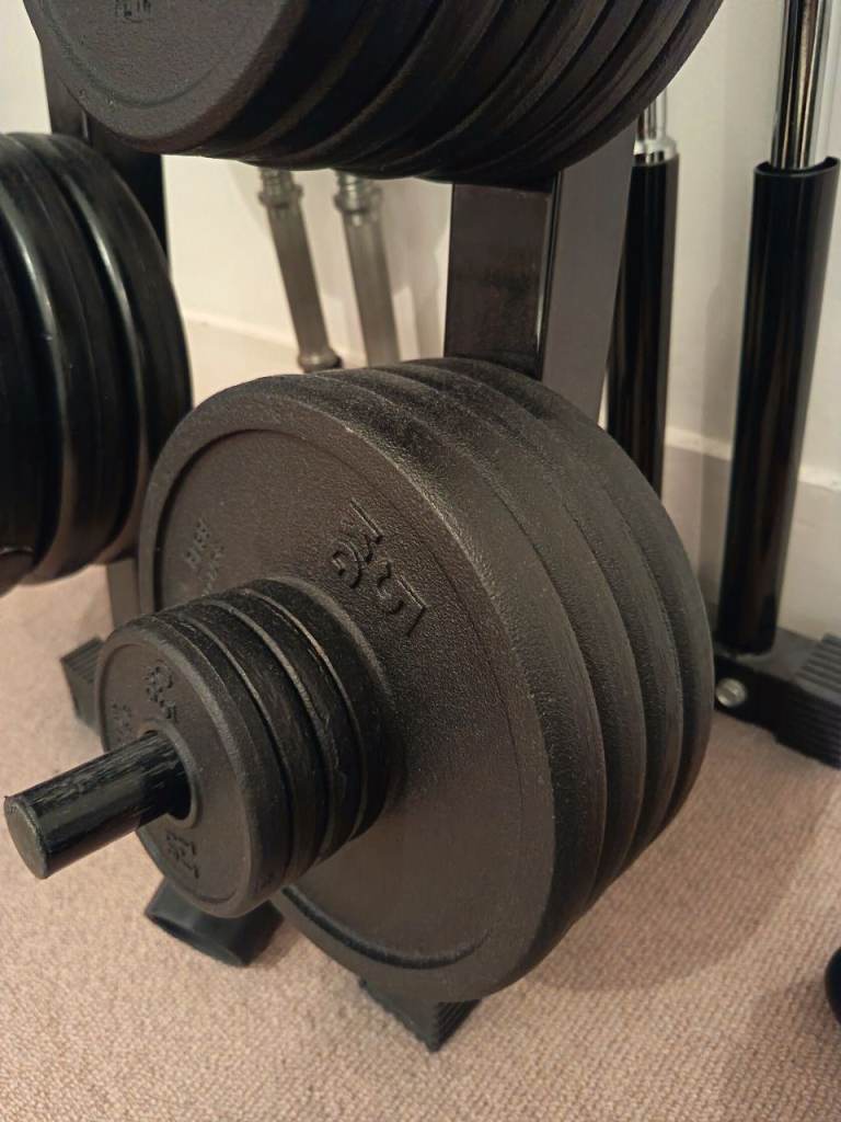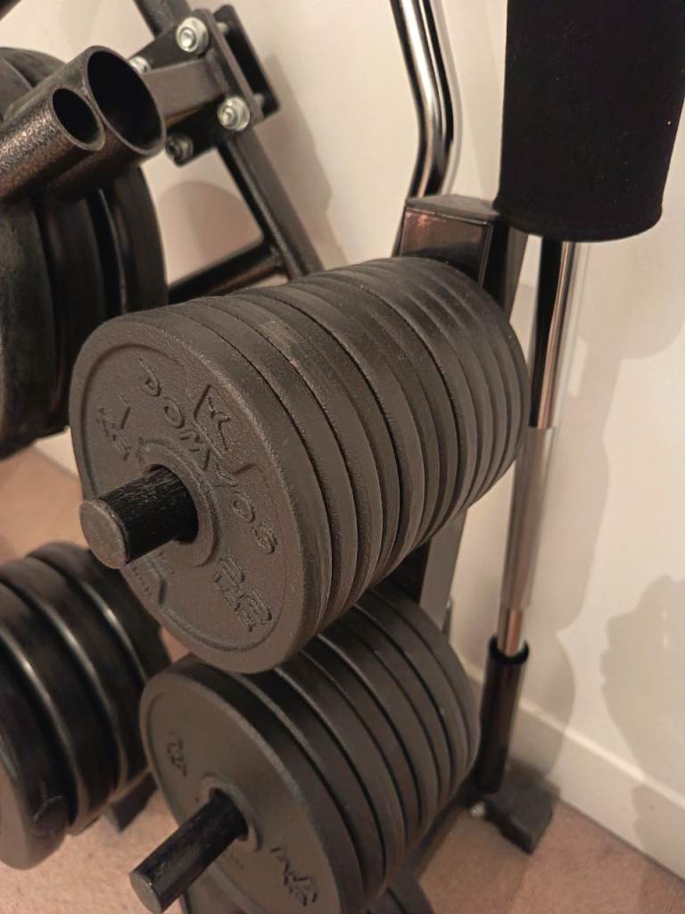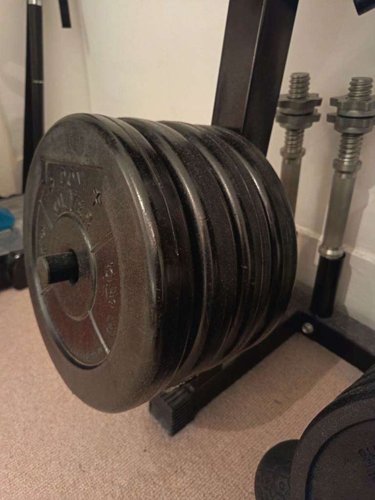 102kg of weight plates, bars, rack and several accessories for only £150!