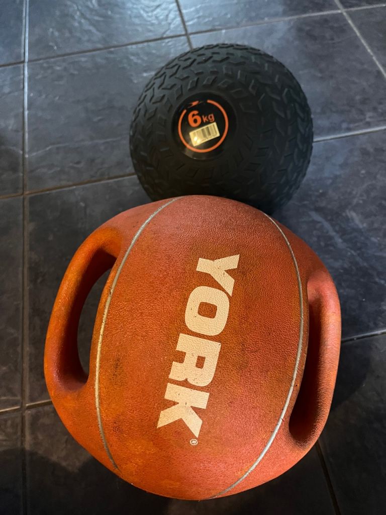 Two gym balls for sale, one orange YORK medicine ball (5KG) and one black slam ball (6KG).