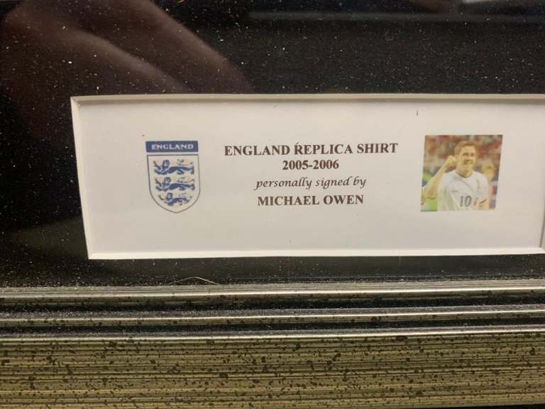Signed and professionally framed Michael Owen England football replica shirt. In excellent condition. Signed in 2005/2006 season. No cert. Pick up only from NE16. Cash only please.