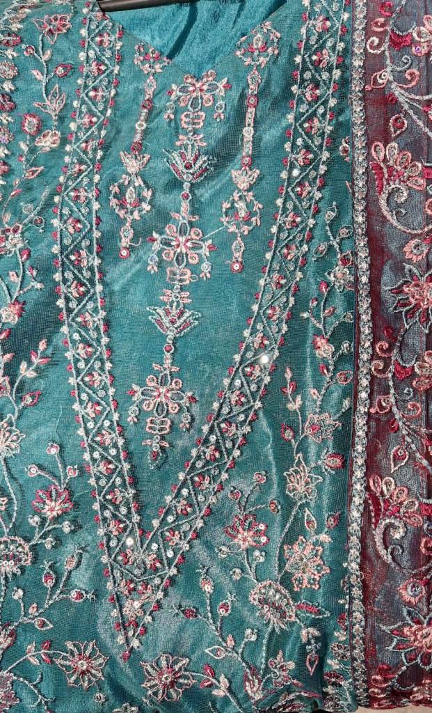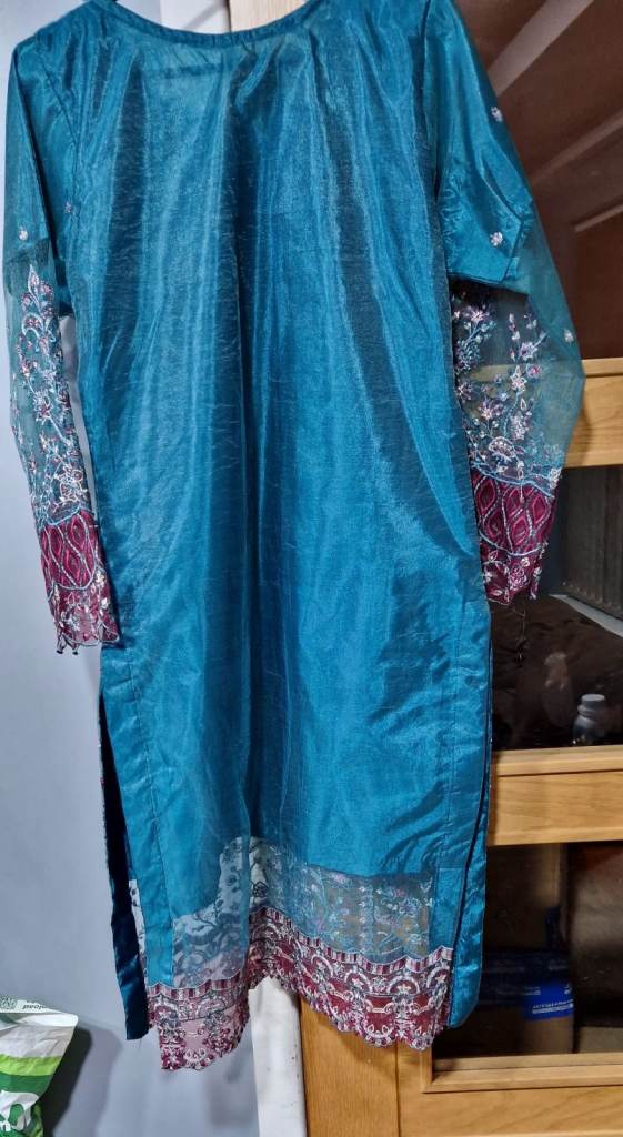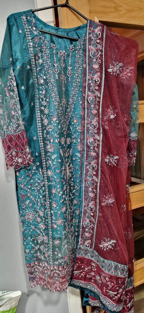 Green/maroon 3 piece suit,medium, new just had sewn but not correct size. Kameez, wide trousers and scarf