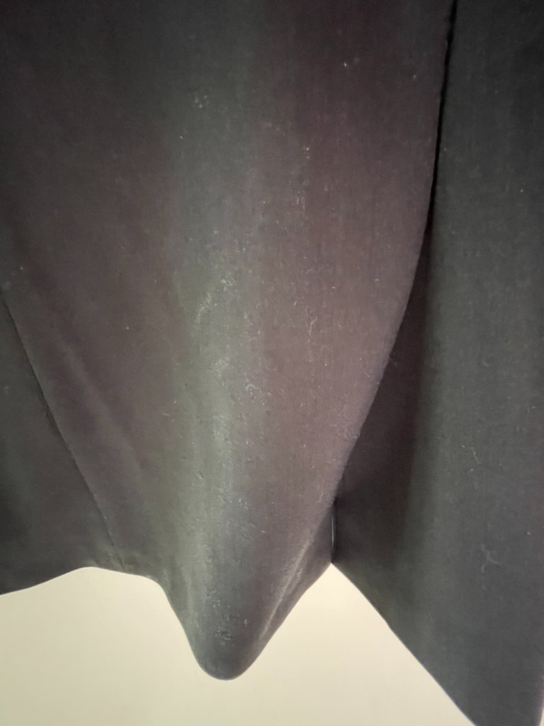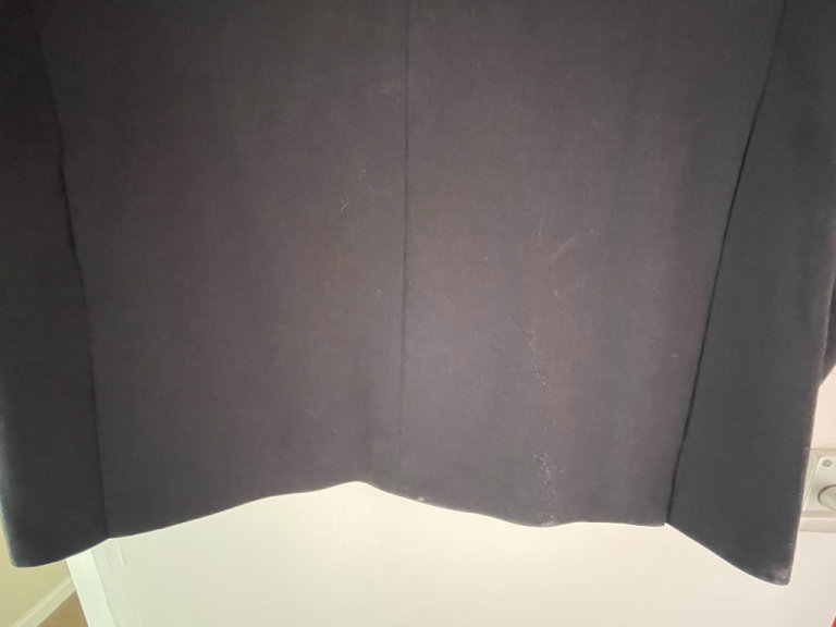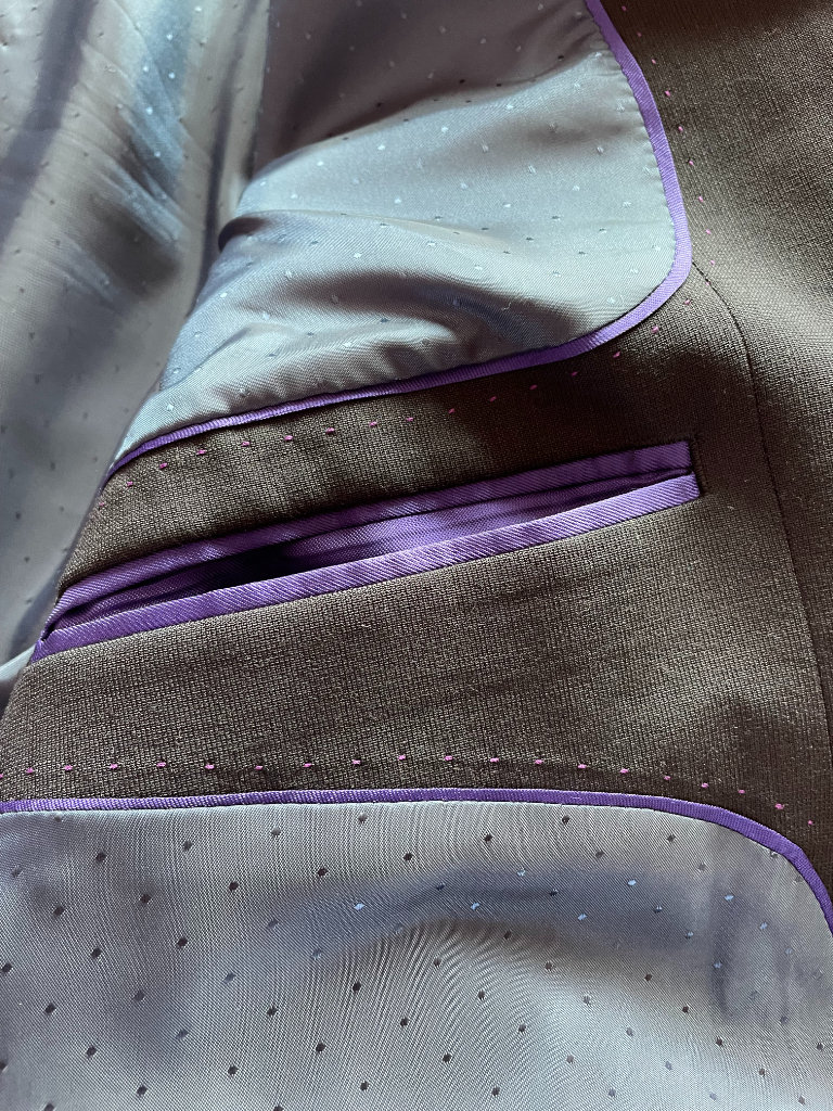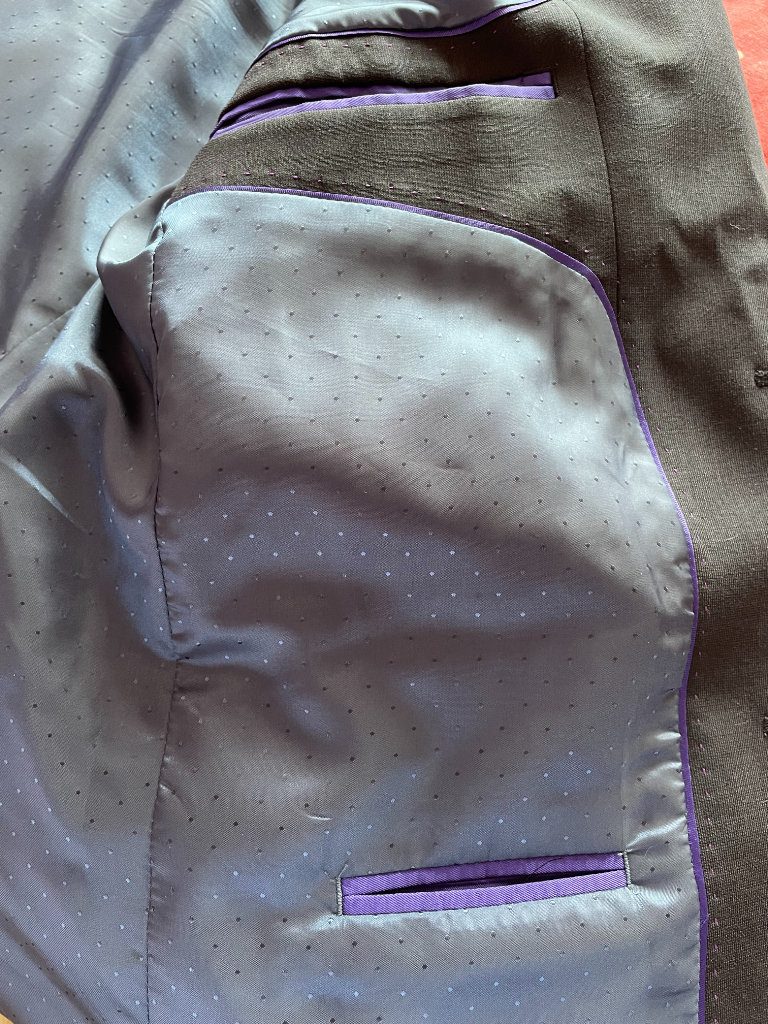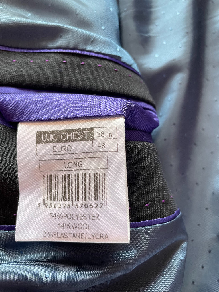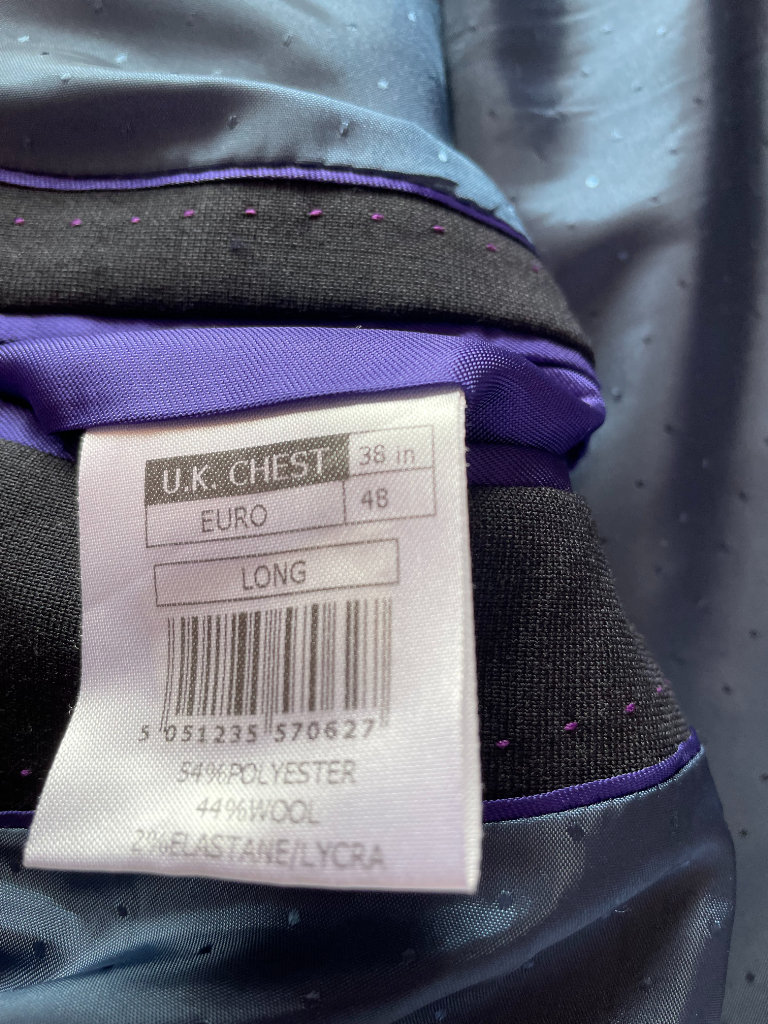 Brand new men's jacket, UK chest 38, Euro size 48, long length. 54% polyester, 44% wool, 2% elastane/lycra. With spare buttons and pockets still sewn shut. Two side slits at back. Actual colour is a slightly smokey black, a little darker than the photos. Sateen effect patterned lining and inside seams/pockets finished with purple trim.