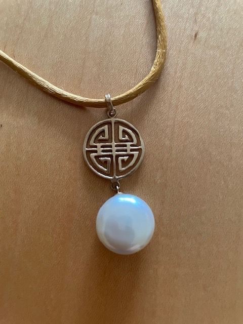 Hand crafted jewellery with gold Chinese emblem and white pearl on fabric rope.