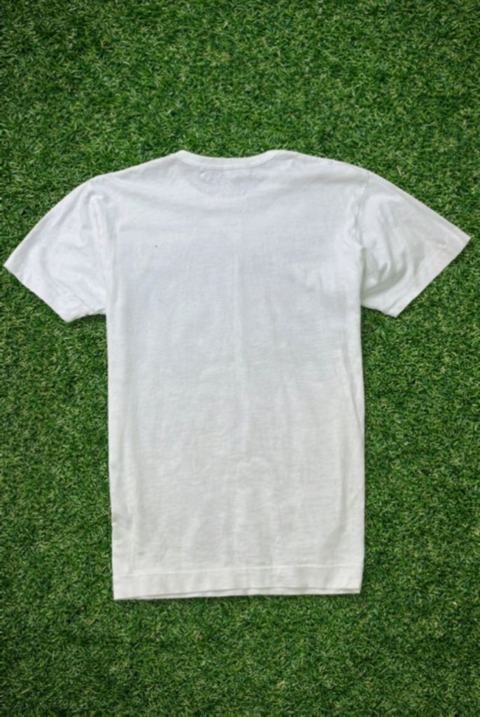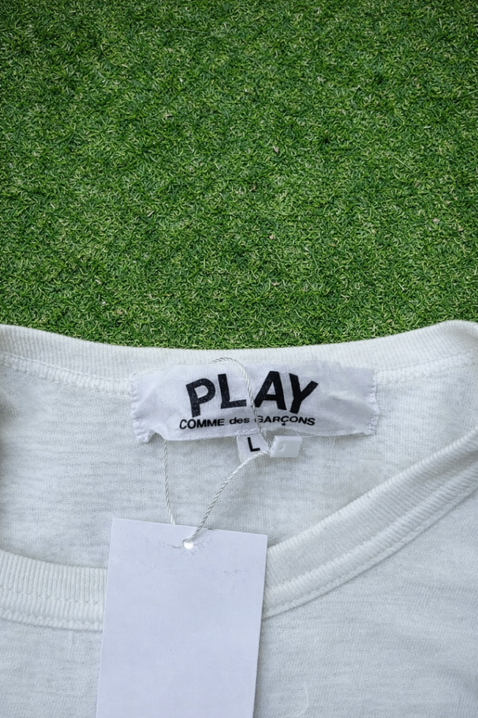 White t-shirt from Comme des Garçons PLAY featuring the iconic camouflage heart graphic with signature eye design.