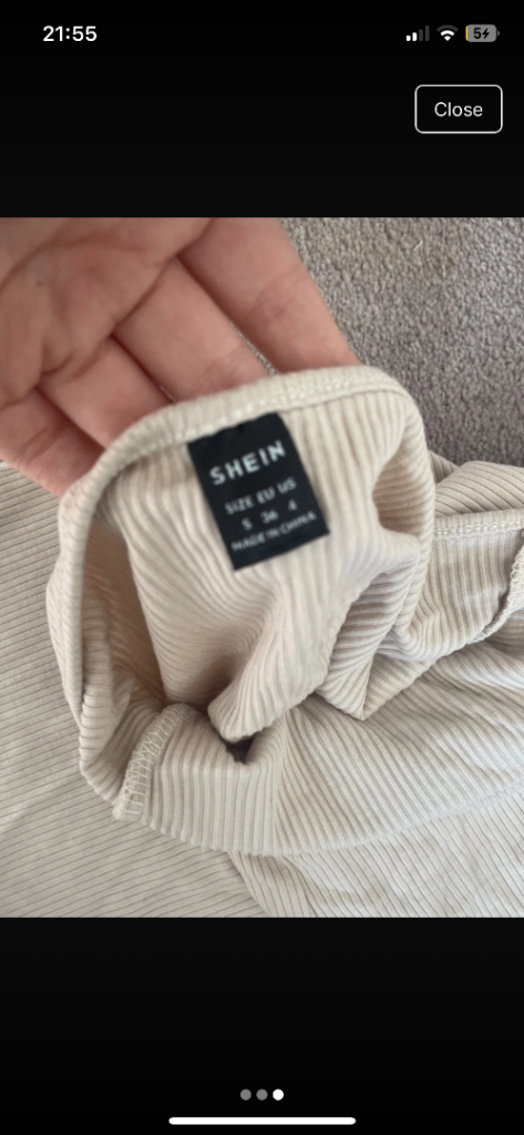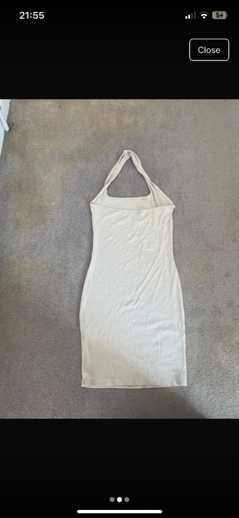 Super stretchy it’s a medium but could fit a large , halter neck no damages
