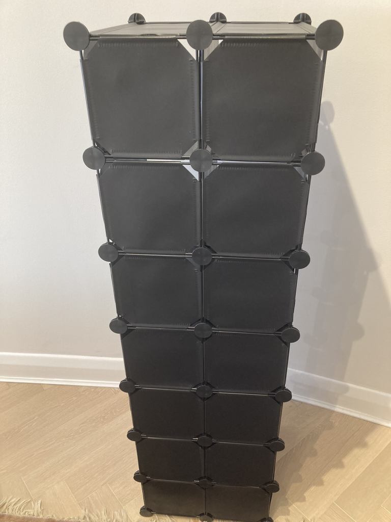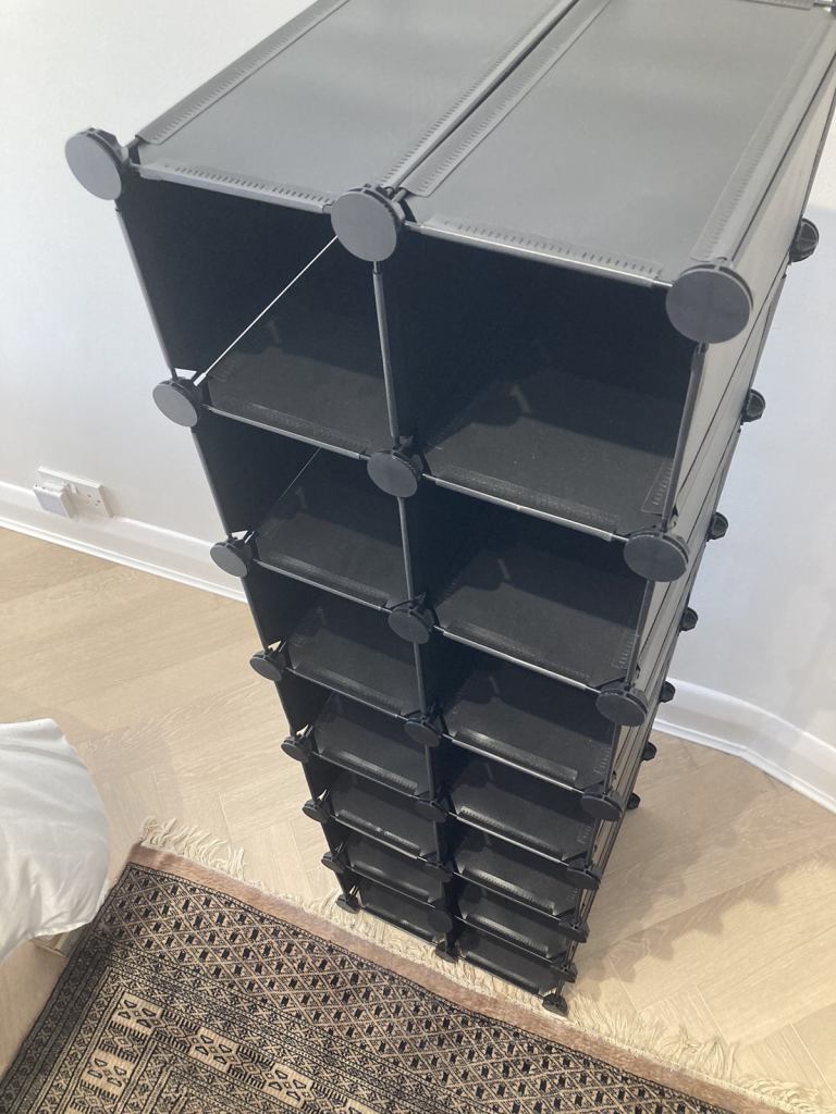 In black PVC. Great condition no scuffs scratches or marks. Assembled but never used. Would be a great addition to any bedroom. H- 48.5 inches/ D- 14.5 inches/. W- 15 inches