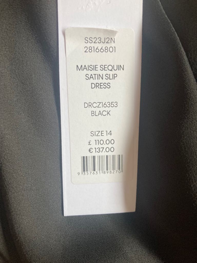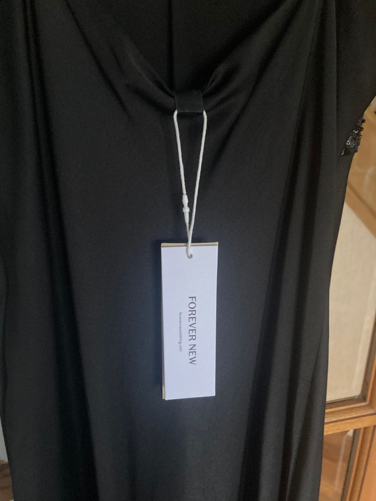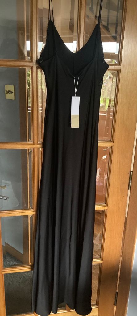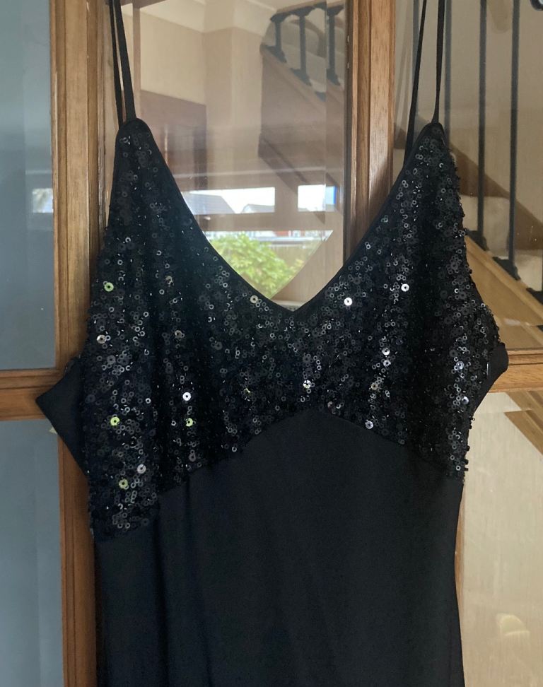 New with tags. Sophisticated satin effect long black dress with subtle sequinned bodice. Size 14. Ideal for Christmas and special events.