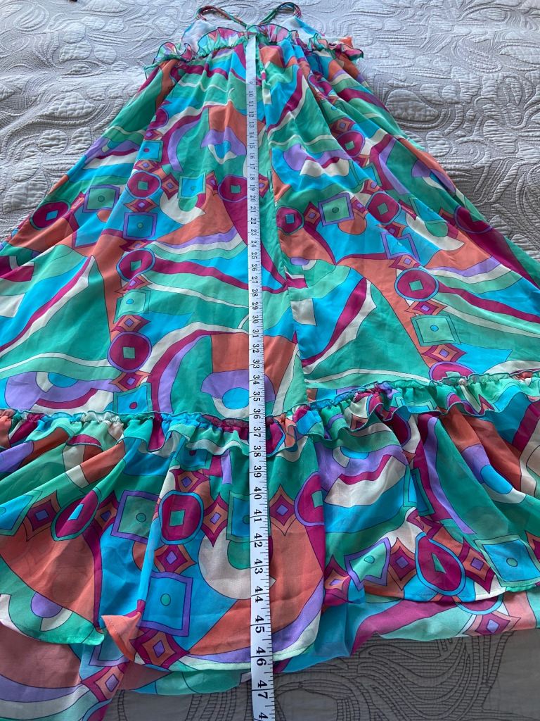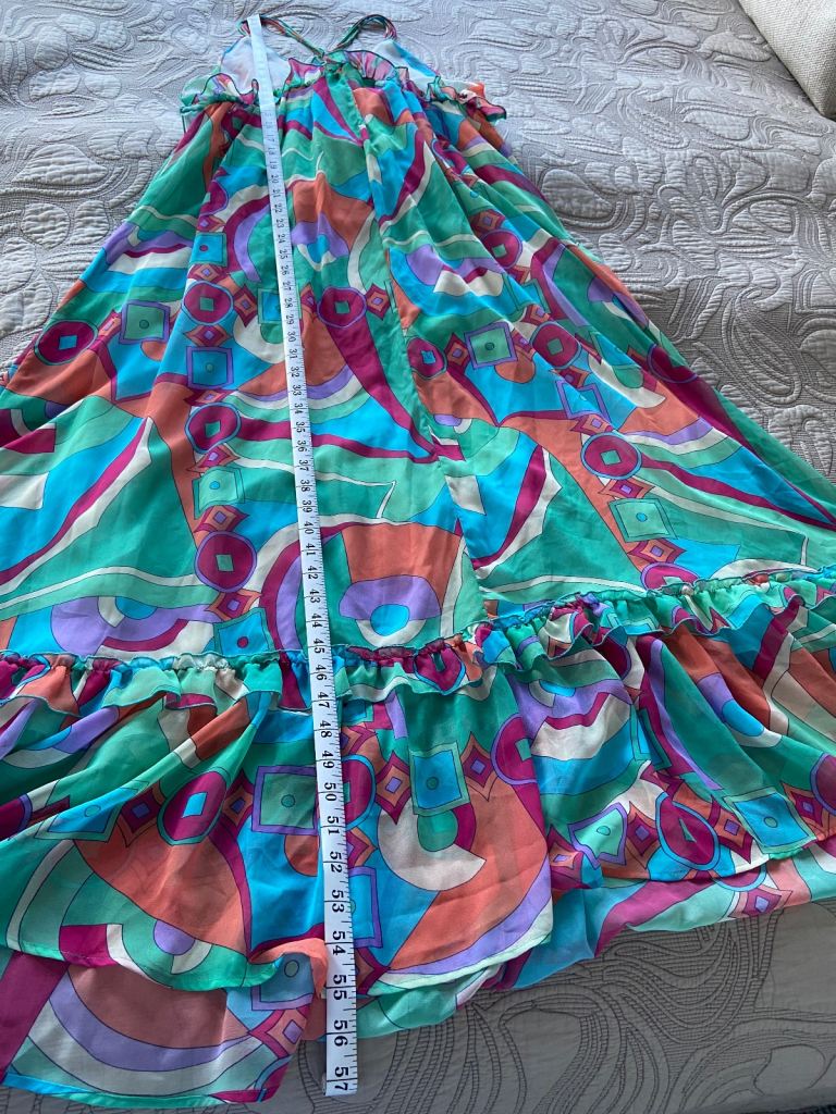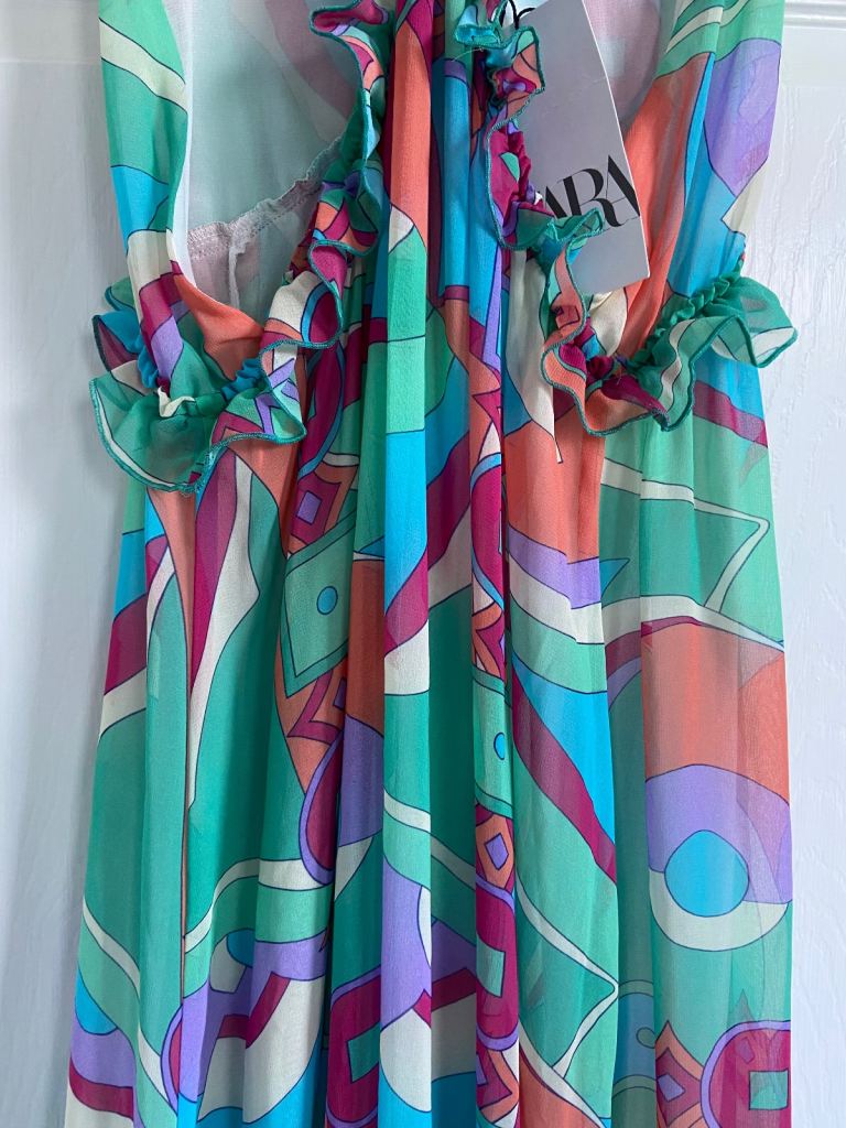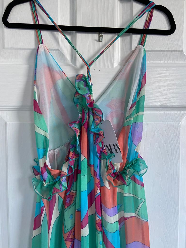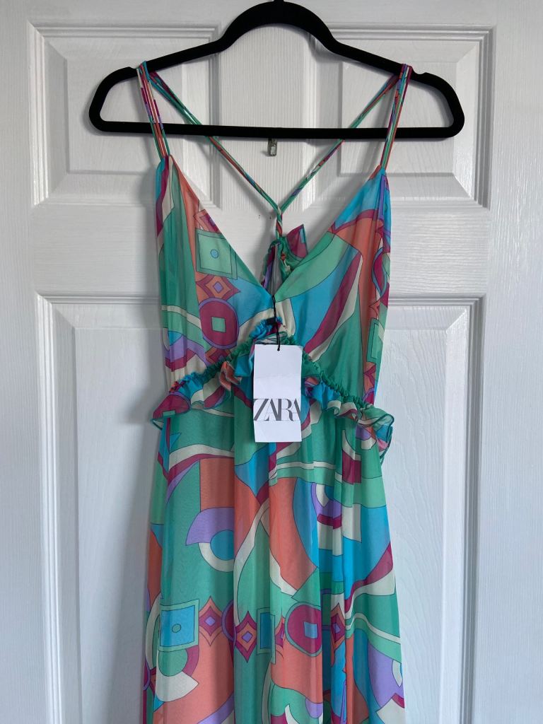 Absolutely stunning light floaty romantic maxi dress from Zara Size L BNWT tutti frutti abstract print makes of perfect for summer parties or holiday. The dress has multi straps twisted into a Y back design, frill ruffle tiered body, lined, this will look amazing with a tan 😍