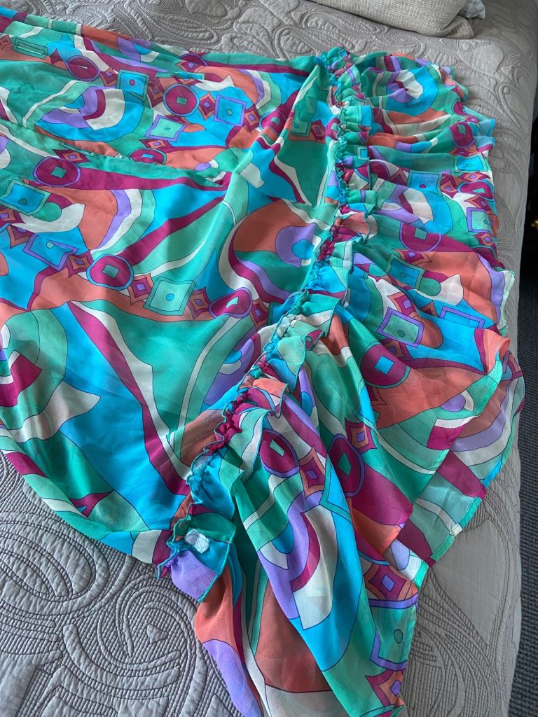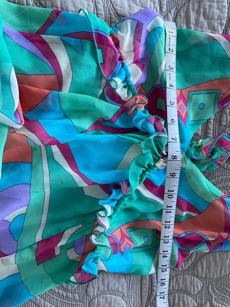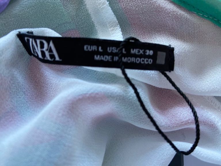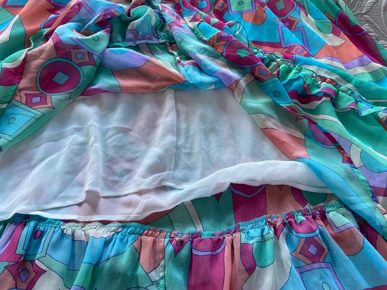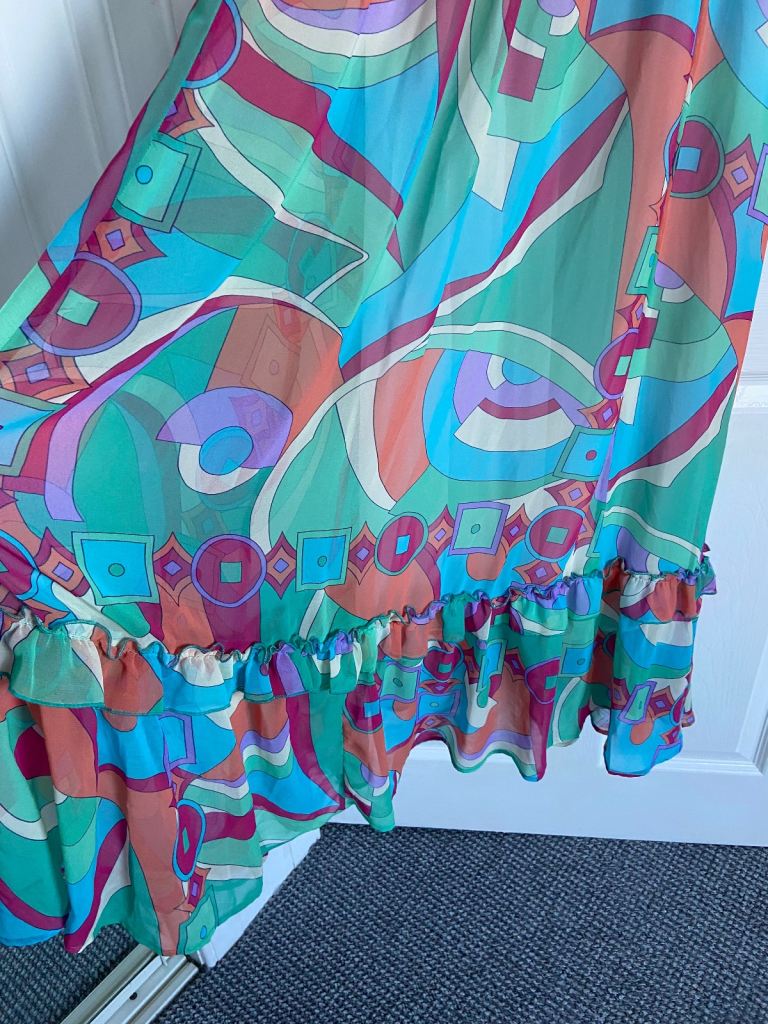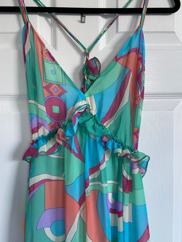 Absolutely stunning light floaty romantic maxi dress from Zara Size L BNWT tutti frutti abstract print makes of perfect for summer parties or holiday. The dress has multi straps twisted into a Y back design, frill ruffle tiered body, lined, this will look amazing with a tan 😍