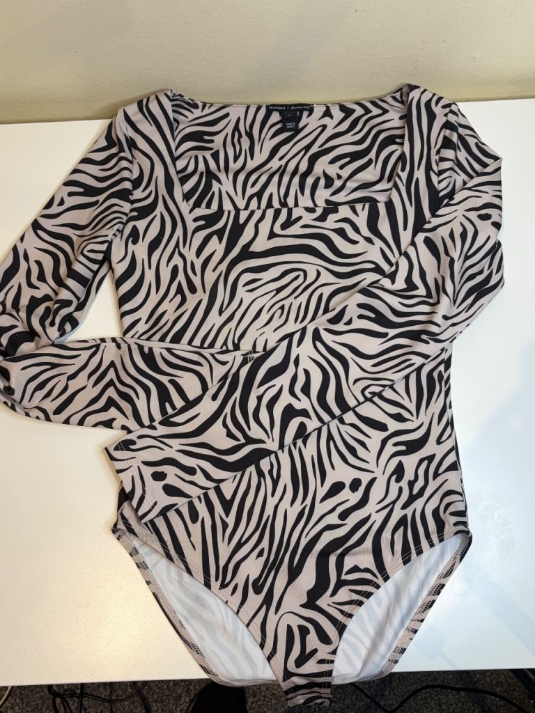 Stylish zebra‑print long‑sleeve bodysuit in a fitted, flattering cut. Soft and stretchy material, super comfortable and perfect for nights out or layering. High‑cut leg and collared neckline give it a trendy, chic look.