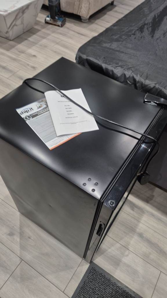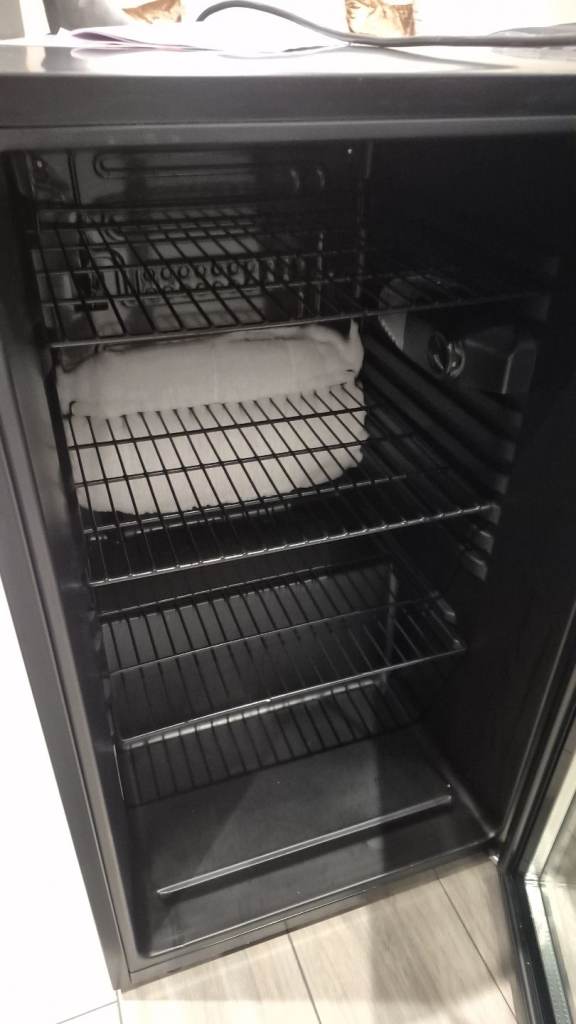 Glass door fridge, as new barley used. Ideal for home var or manvave. Still have original booklet.