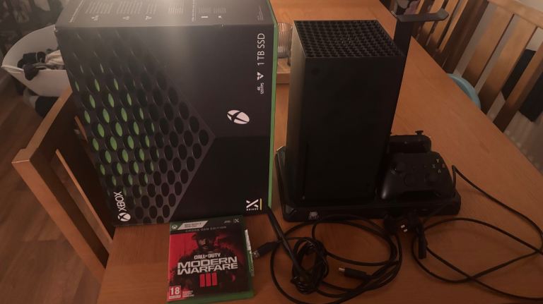 Logitech racing wheel and pedal set, perfect for realistic racing games.