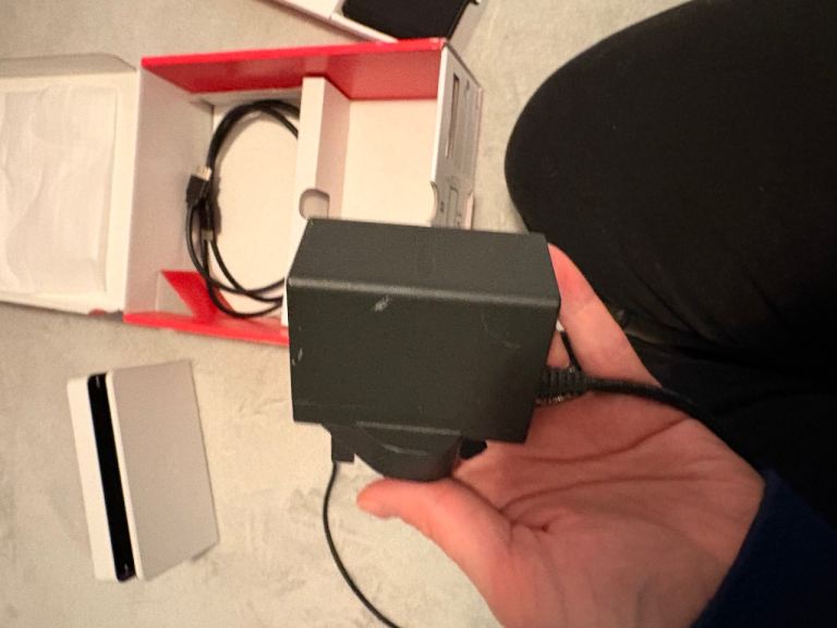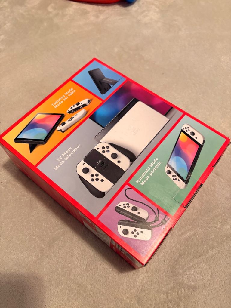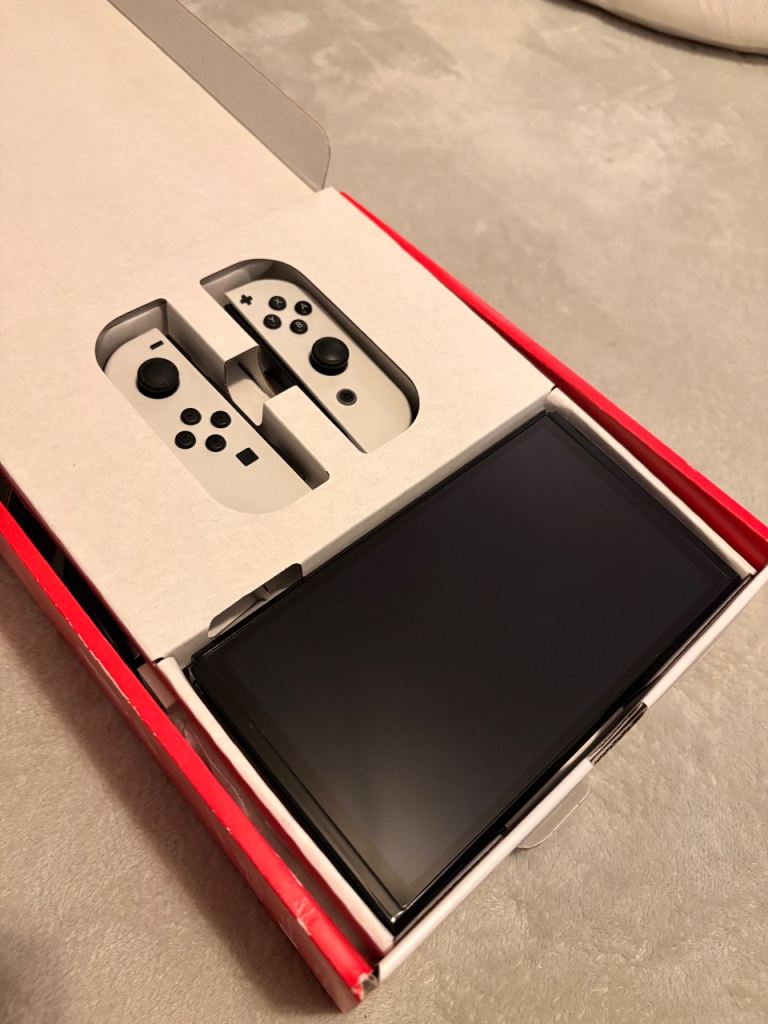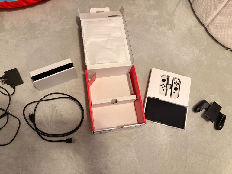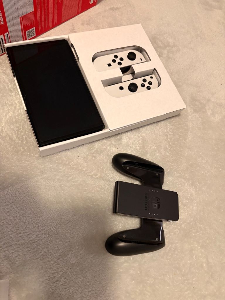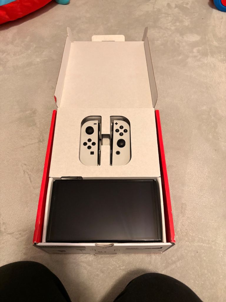 Switch OLED, white with joycons and dock. Comes with box. This item is in fantastic condition. Very minimal signs of wear. Screen in great condition. Only wear noticeable is on the plug.