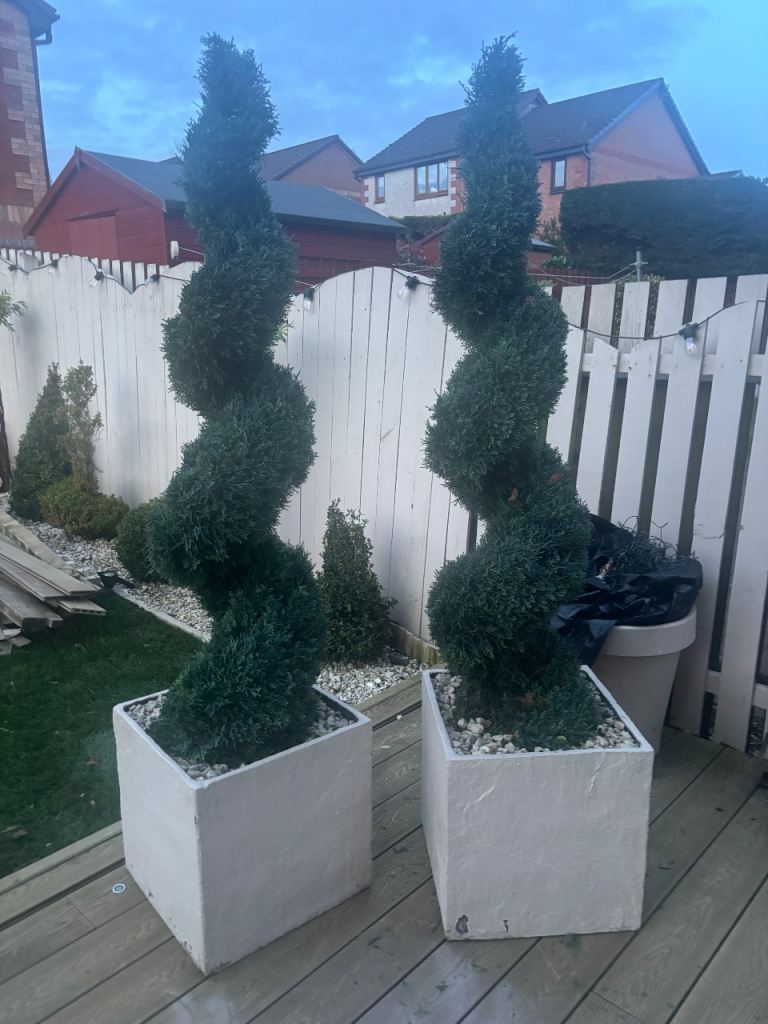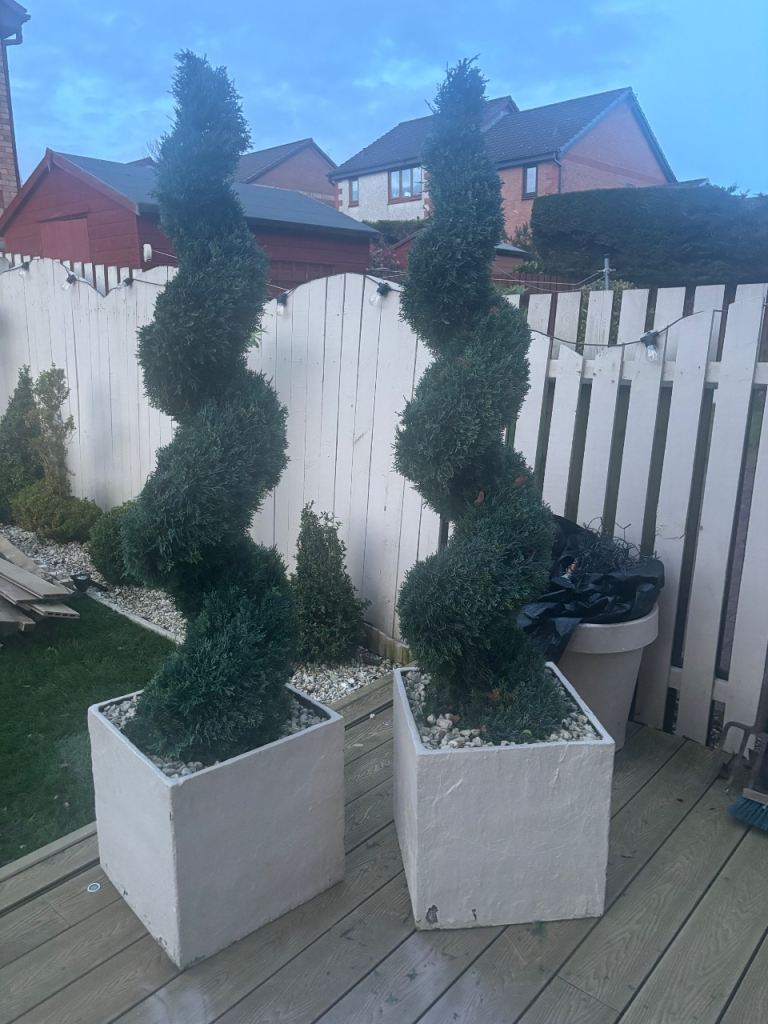 2 costco artificial spiral trees in a cream boxed planter !! planter could be painted any colour £90 for both