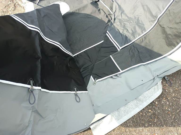Details Depth: 2.5 m Removable/fold-down panels: Front and side panels. Integrated top ventilation Mosquito net in both sides Standard Equipment Collage Sand curtains Veranda pole Draught skirt Wheel arch cover FixOn Typhoon storm sashes Awning bag Pole and peg bag including peg remover.