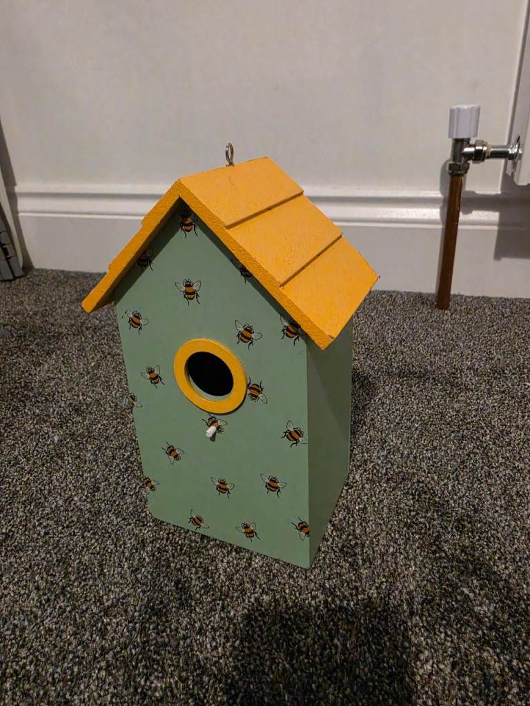 Cute wooden bird house with a lovely bee pattern, ideal for adding a bit of character to your garden.