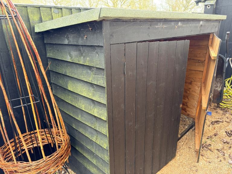 Wooden corner pergola with trellis and seating. Needs some work…some of the slats have broken but if someone doesn’t mind a bit of work, this is a lovely seating area in a sunny spot. We were going to get the slats to replace, but don’t feel we want the work now. Will need dismantling, if possible, as some screws are rusted! If not, could be cut up for scrap wood, but that seems a shame. The trellises could be used for climbing plants.