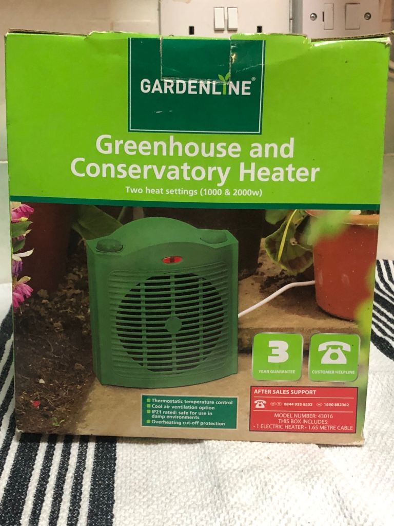 The item shown is a Gardenline Greenhouse and Conservatory Heater (Model No. 43016).