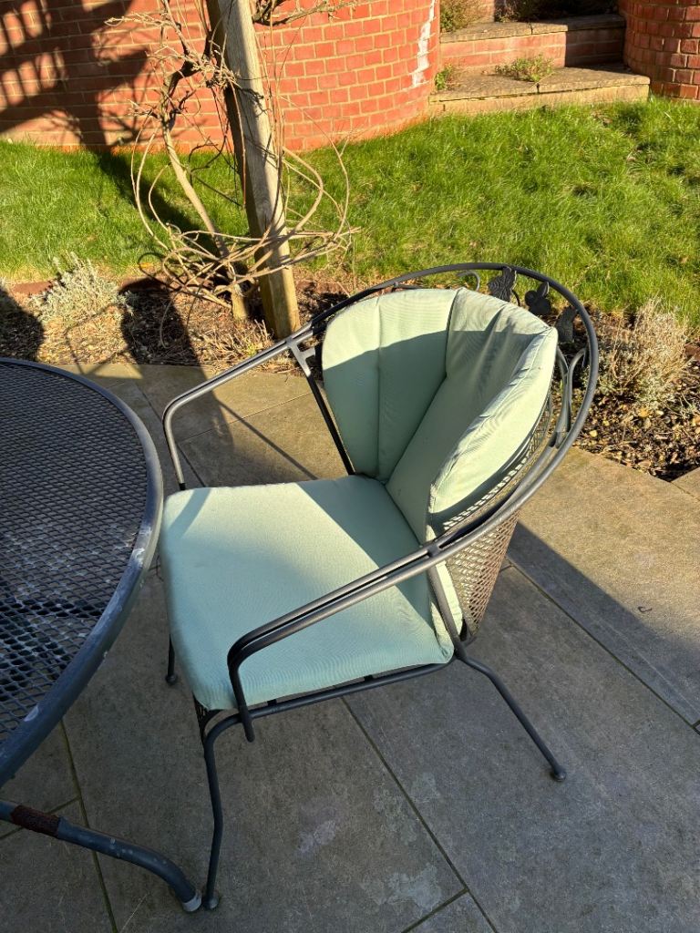 Metal garden table and 4 chairs , plus 4 seat cushions