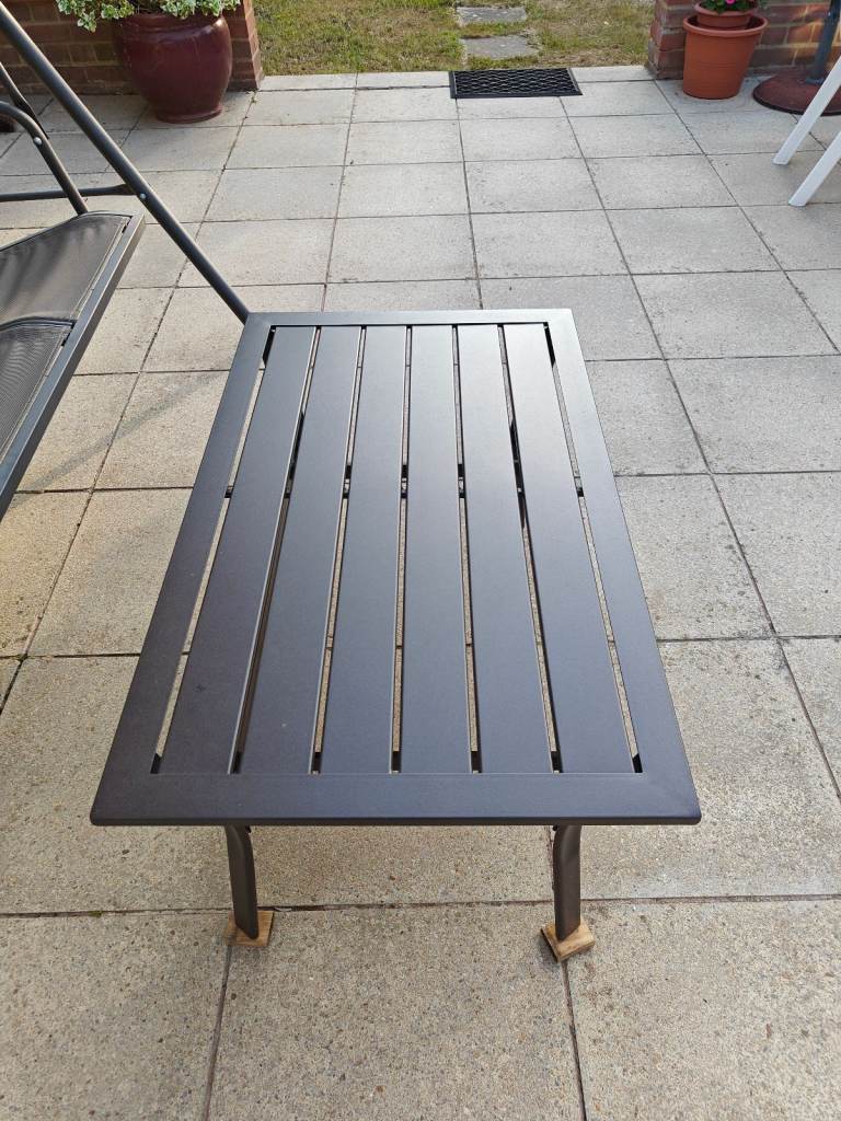 Outsunny Metal Garden Coffee Table, Rectangular Outdoor Side Table with Slatted Tabletop, Foot Pads for Outside, Garden, Balcony, Porch, 91.5 x 55 x 45cm, Brown