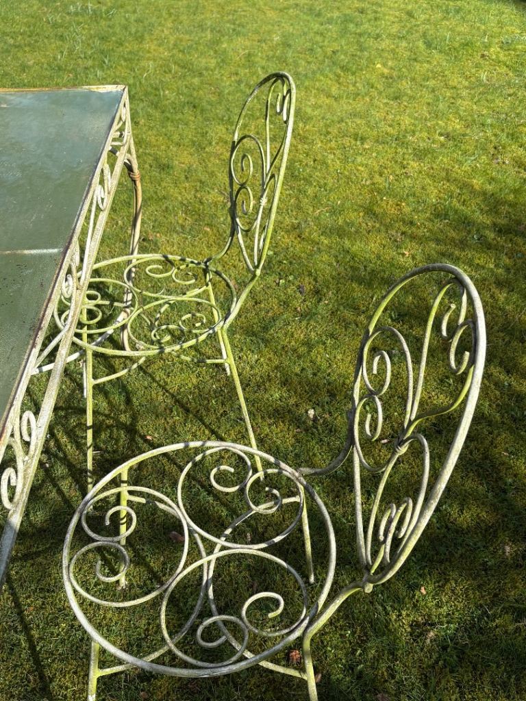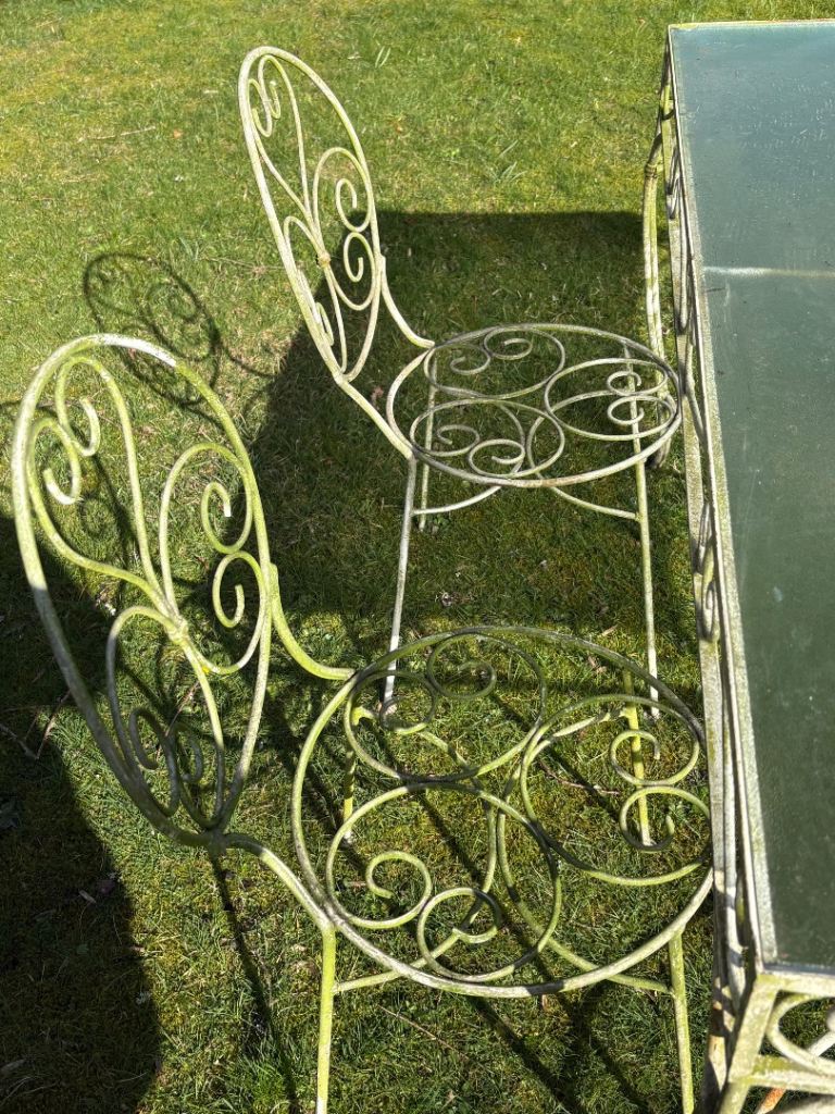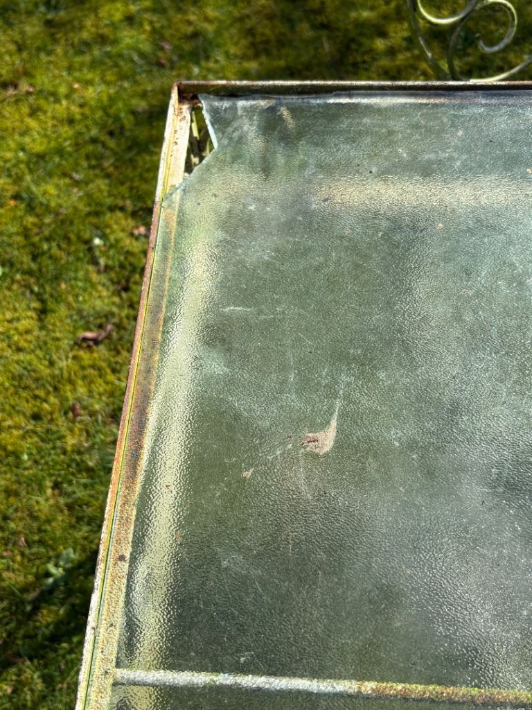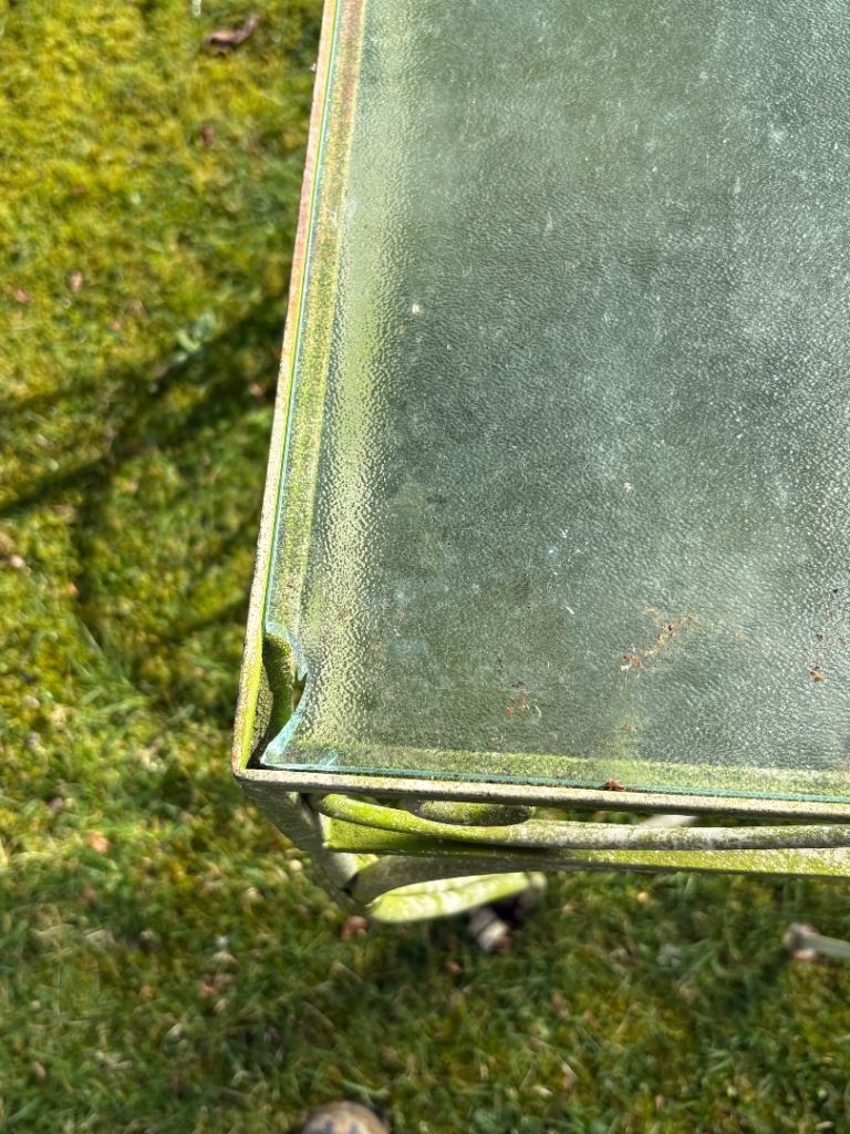 A white wrought iron table with glass top in need of a clean and maybe a re-paint. The glass is missing a bit in two corners as per the photos. Measurements are length 5ft x width 30 inches or 152.5 cm x 76 cm x 30 inches or 76 cm high
