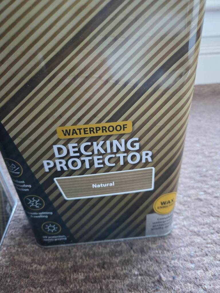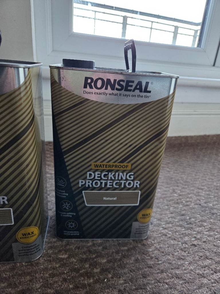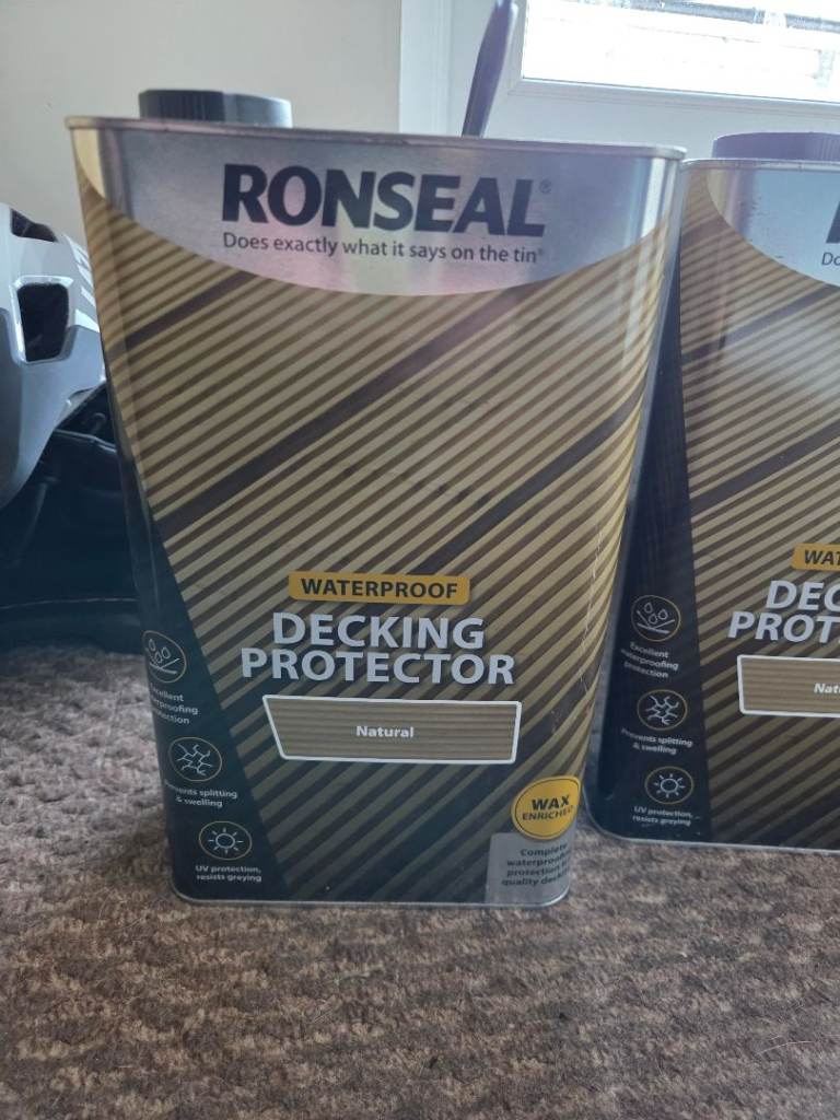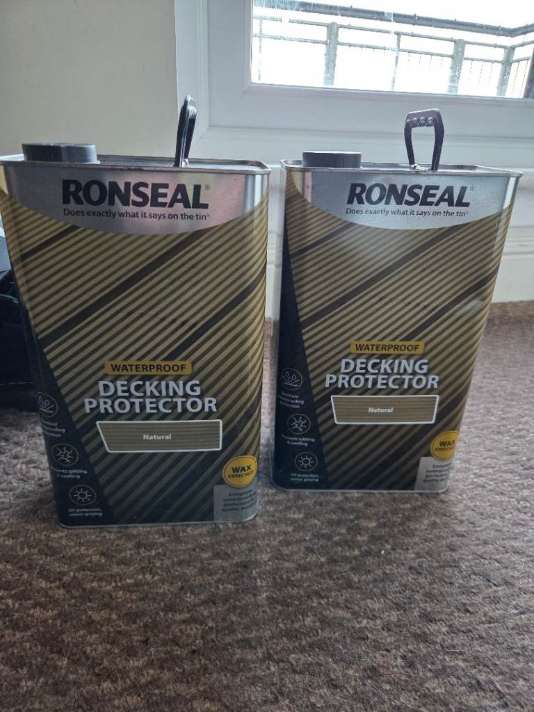 For sale are two 5-litre tins of Ronseal Waterproof Decking Protector in 'Natural' finish.