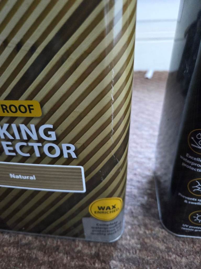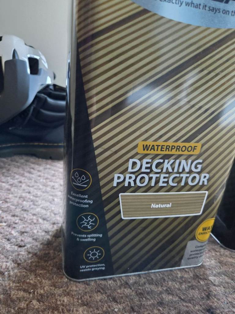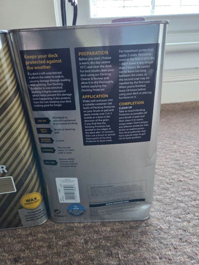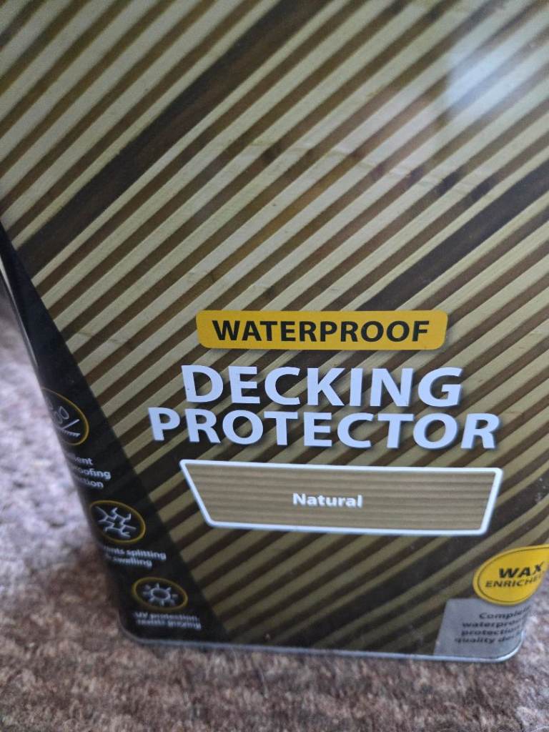 For sale are two 5-litre tins of Ronseal Waterproof Decking Protector in 'Natural' finish.