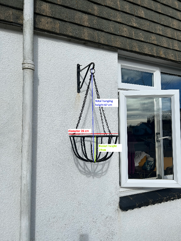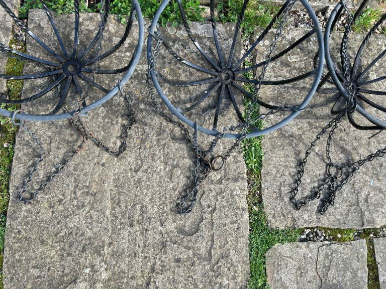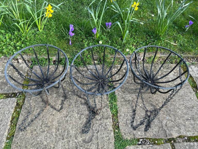 3 x black metal hanging baskets in good condition but slight rusting on chains (see picture 3). No longer required.
