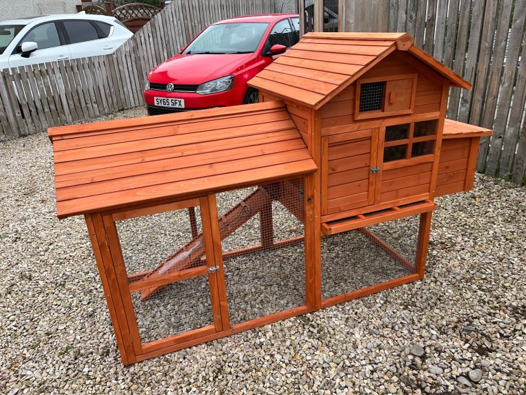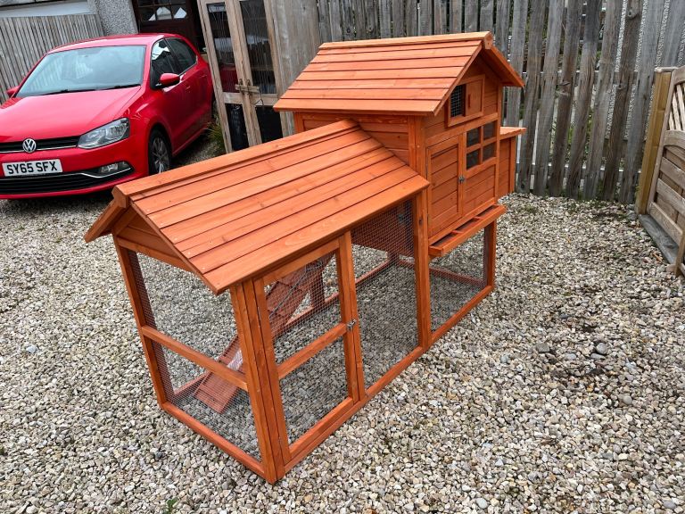 Small wooden chicken coop suitable for two or three birds (depending on size) it has a small run area, a roosting area and two nesting spaces. 700mm W x 2100mm L x 1330mm H