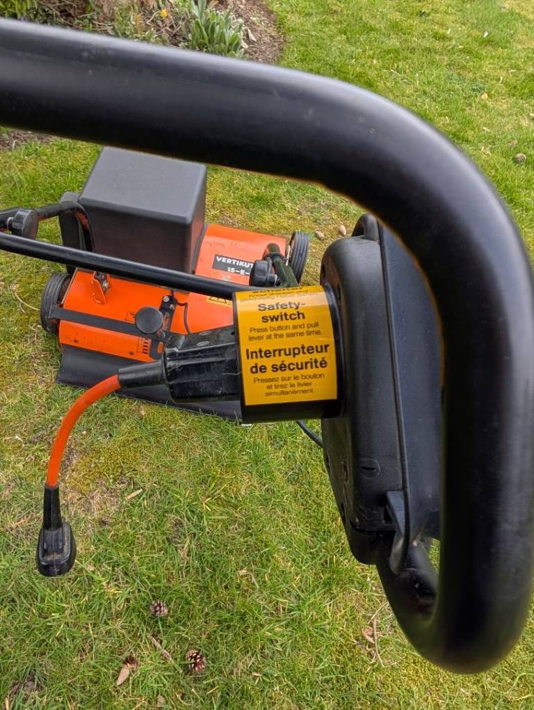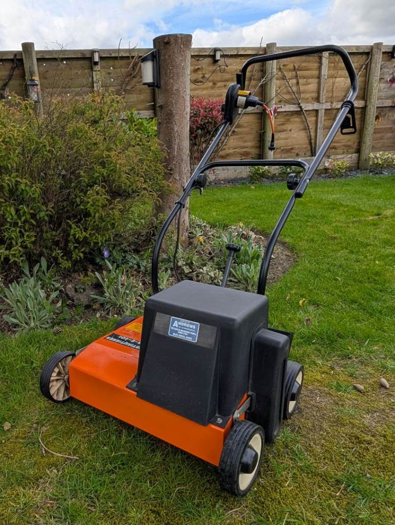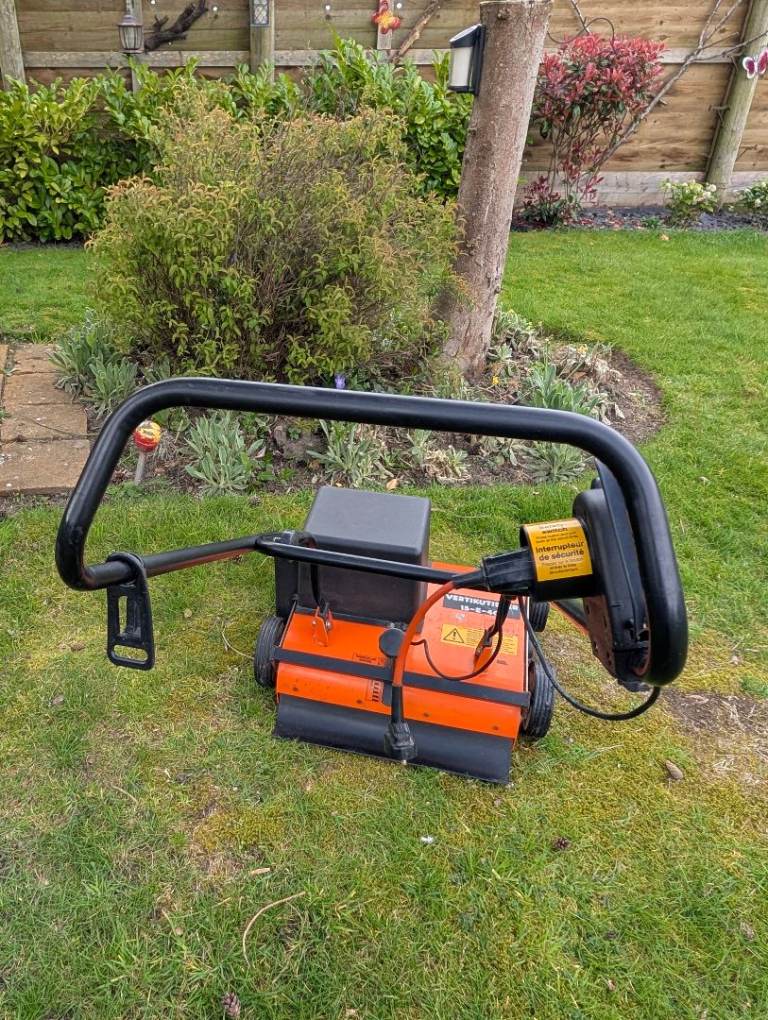 Electric scarifier with 25/30 metre extension cable. This machine is designed for small to large sized gardens, features a robust construction in metal/plastic. Machine has a working width of 40cm and is equipped with 14 blades that rotate in a spiral pattern to minimize damage to the lawn. Also inclused infinitely variable height adjuster for precise blade placment. Spares parts are still available through ebay and other websites.