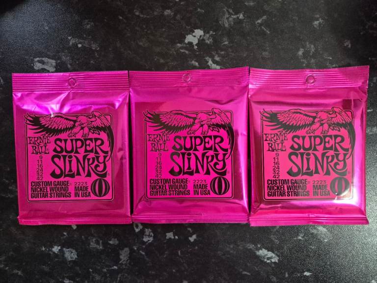 3 packs of Ernie's Super Slinky strings. These are from an eBay shop which I trust and use a lot; they are not cheap Chinese knockoffs which flood eBay and Amazon. I paid correct retail price for these; I don't sell rubbish.