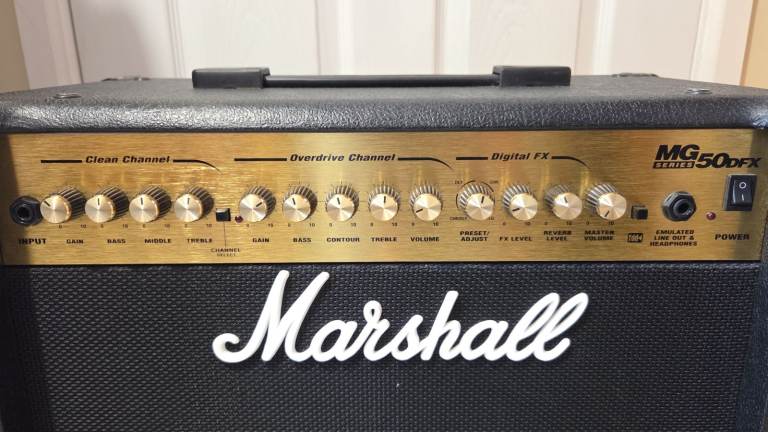 For sale: Marshall MG50DFX solid-state combo amplifier, bought in 2002 and only ever used at home for practice. Fully working and a great, versatile amp suitable for home or studio use.