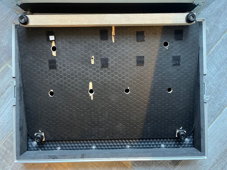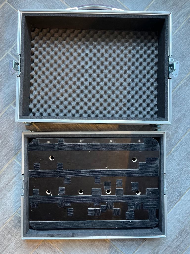 I bought this flight case (£210 new) during the pandemic when I was starting to build my pedalboard. In the end, I never took it out of my room, and I barely have time to play these days. I'm only selling it as it's overkill for my use. The case is in excellent condition, pretty much like new. The board itself has been modified: I drilled holes into it so as to pass cables through it, and added a pice of wood with rubber feet on one side so it's tilted.