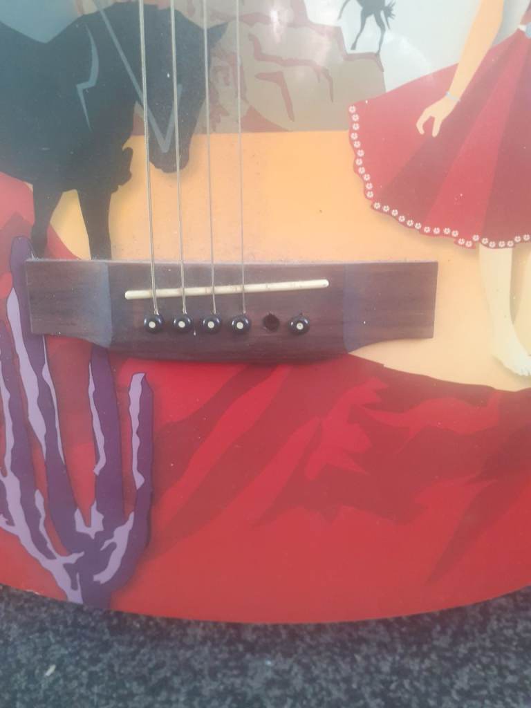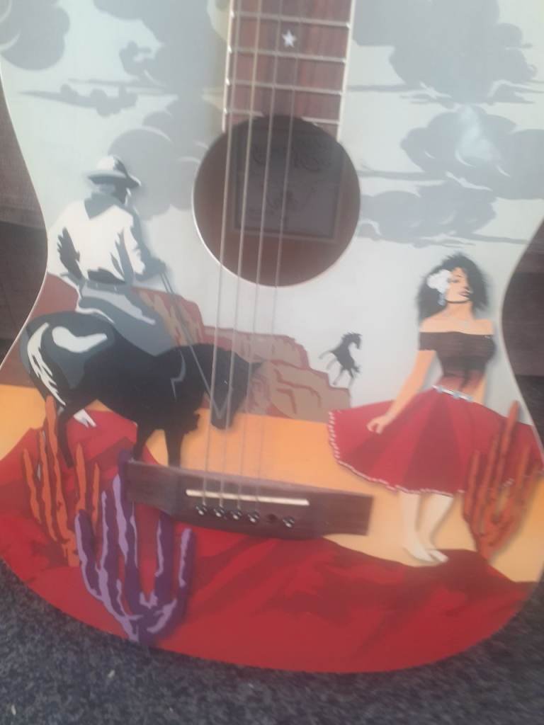 Features a detailed illustration of a cowboy and lady in a desert scene printed directly on the soundboard – a real eye-catcher and perfect as a display or collector’s piece.