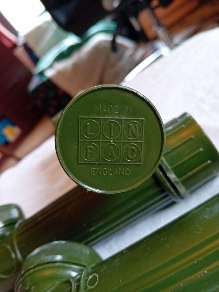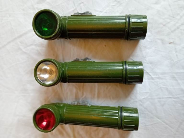 British Army right angle torches for sale. 3off them made by linpac. Selling my WW2 items as listed on this site with other items. All working and come with 2 spare bulbs each in the end cap of each torch.Used condition but in good order.