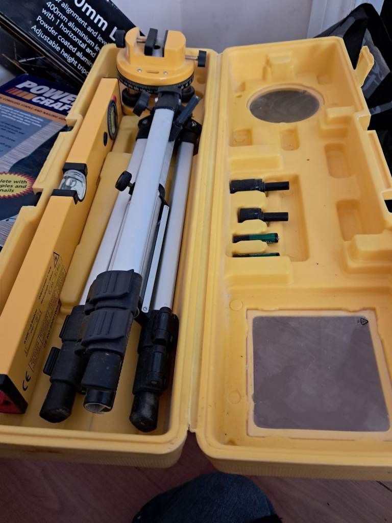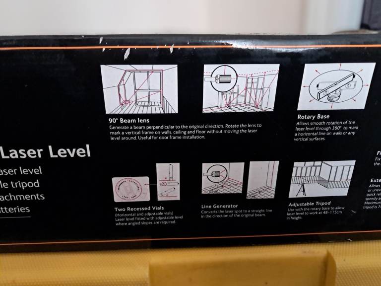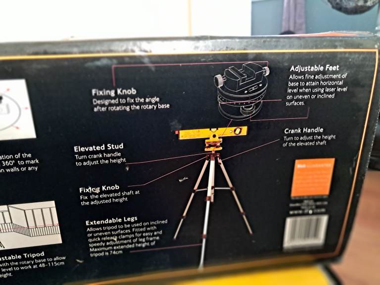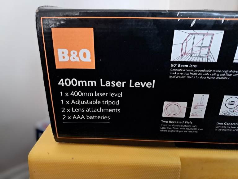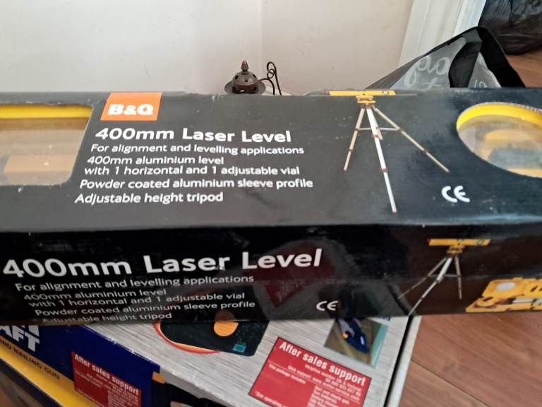 B & q 400mm laser level with one horizontal and one adjustable vial comes with adjustable height tripod.