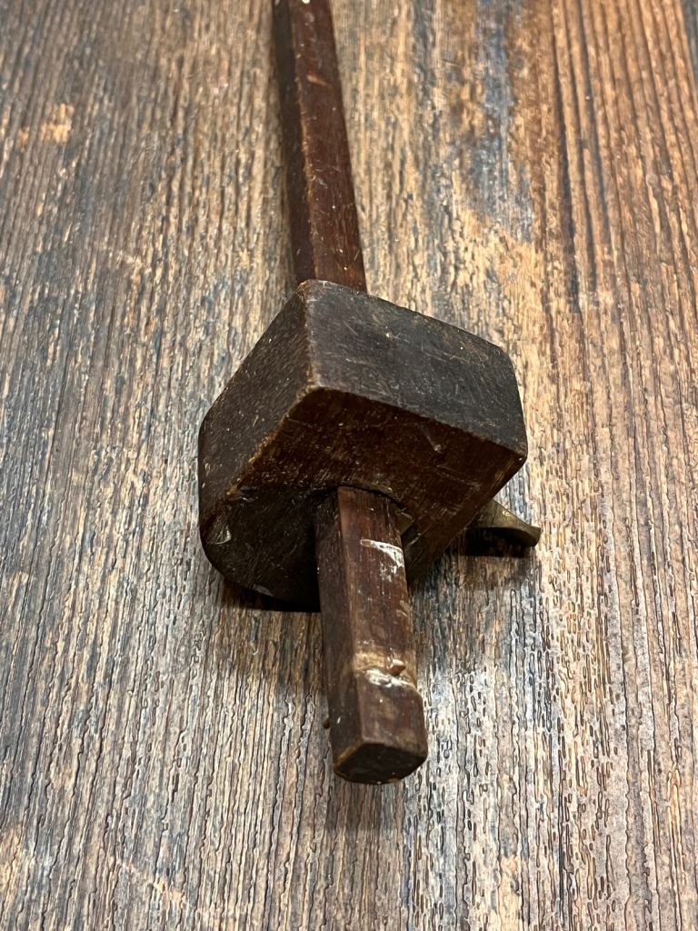 A traditional wooden antique marking gauge used by carpenters in woodwork. It is in good, strong working condition as far as I can tell (not that I have any idea how to use it!) with some signs of use which is to be expected with working tools of this age.