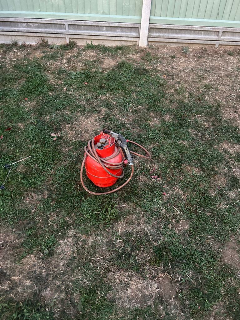 Roof blow torch gas bottle and gun. Missing hose connector to bottle