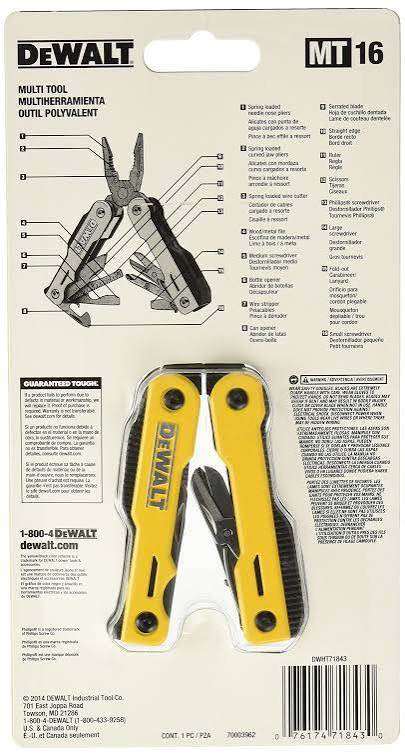 The Dewalt DWHT0-71843 16-In-1 Multi Tool from ITS is your solution to having a range of handy and essential tools stored neatly in your pocket – ready for action when you need it.All tools have been made with rust-resistant stainless steel for extended longevity while the soft grip side panels allow for a comfortable hold.Built around a pliers design, the multi tool also includes Phillips Screwdriver head, Pozi Screwdriver head, scissors, knife and combination pliers. Among the additional, site essential tools include a metal tin opener, bottle opener…and a nail file.