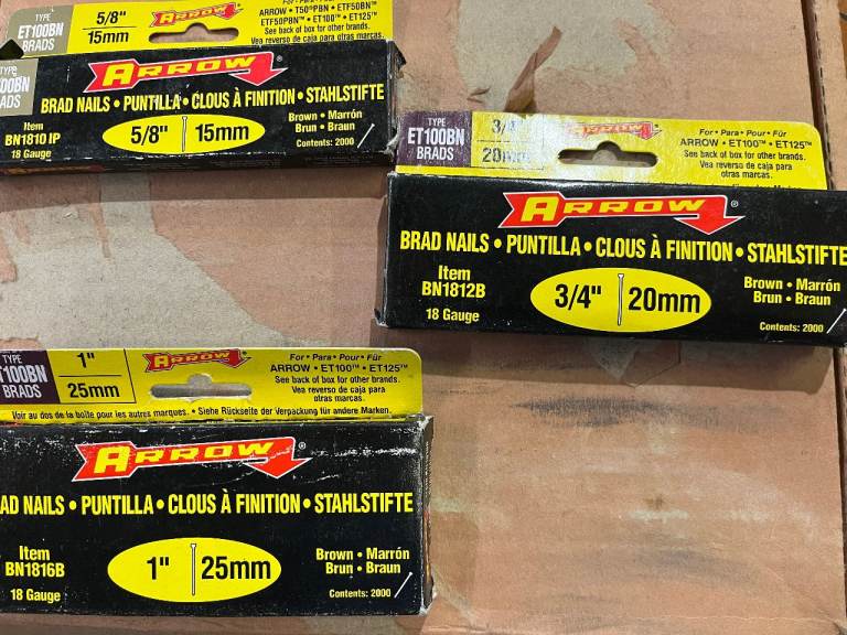 Uses 15mm, 20mm & 25mm Brad nails. 1 pack of each supplied with gun.
