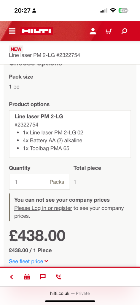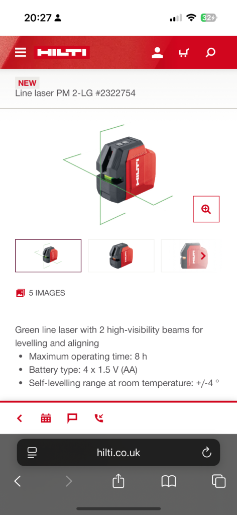 Brand new Hilti pml lg green lazer I never noticed at the time that I bought 2 instead of just one so this one has never been used it comes with its protective case and batteries which are still in there wrapper aswell , this cost me £438 to buy and they still sell for this price on the Hilti website , am looking for £200 for it which is a bargain