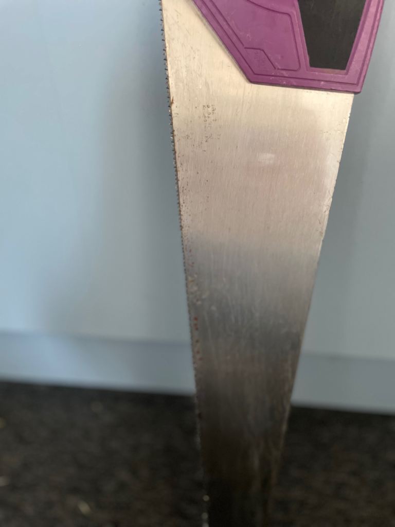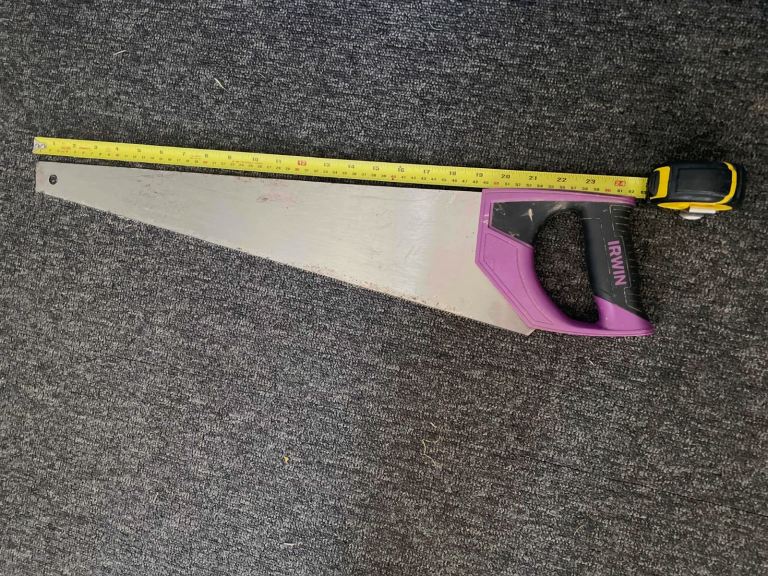 As seen in photographs. Rubber handle for extra grip. Cuts through wood very quickly.