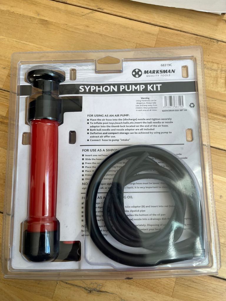 Intake and discharge system. Transfer liquids. Pumps air/any liquid. 2 hoses. Both 127cm long. Brand new in original packaging. Available to collect Tooting Bec,