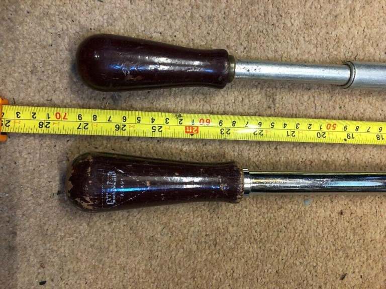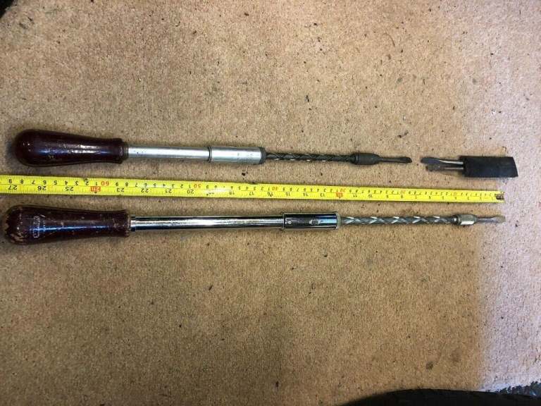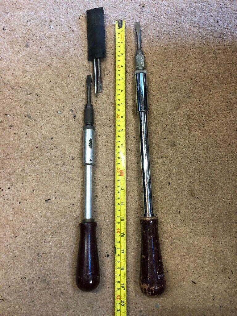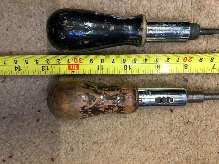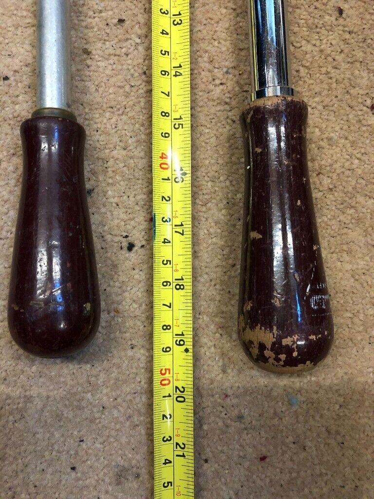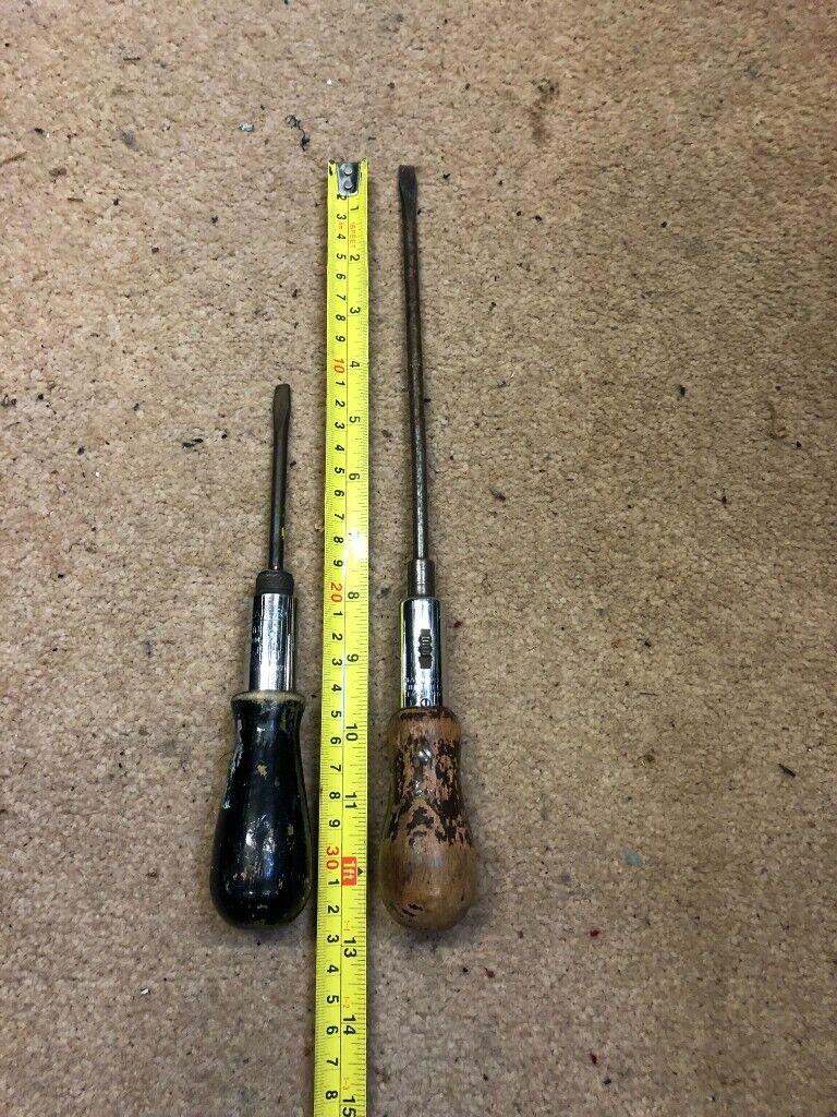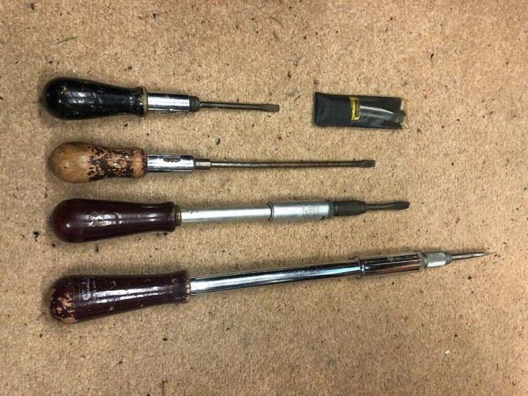 Here we have a pair of Yankee Pump Screwdrivers and a pair of Ratchet Screwdrivers all working as they should. There is also a packet with different Driver ends. The smaller Yankee is 14 in long and is made in the USA. The Longer one is 19 in and is made by Stanley. There are also two Ratchet screwdrivers 9 in & 13 in.
