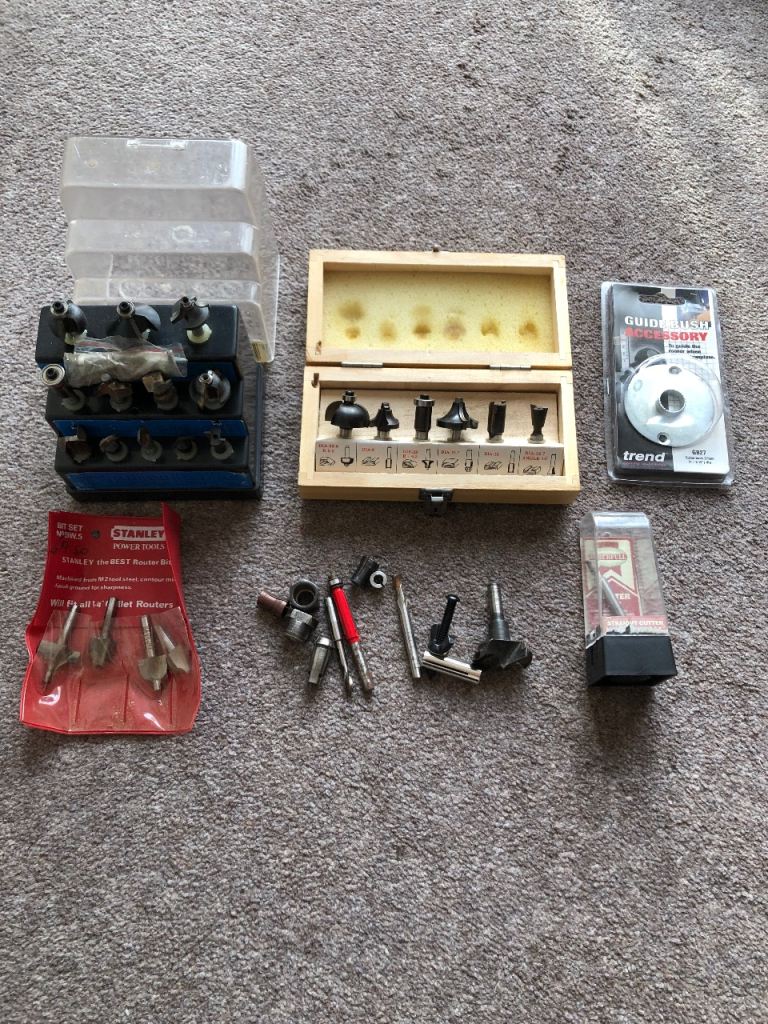 Pro 1020W 6.35mm and 8mm router and variety of router bits including Nutool 12pc 1/4inch bit set and 6pc Kinzo bit set. Used but good condition.