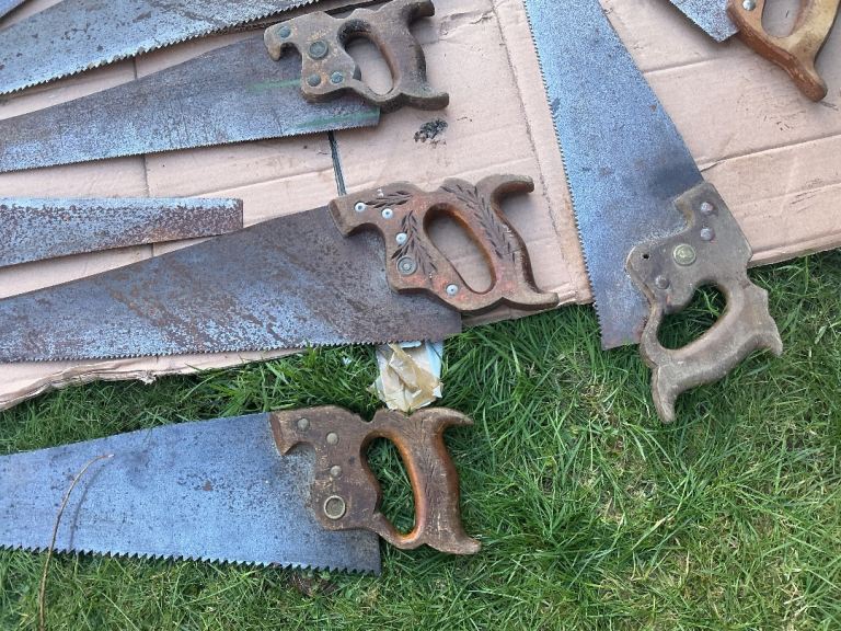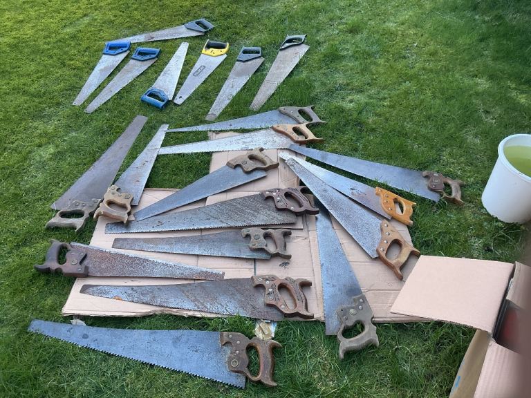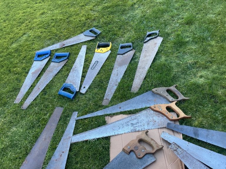 Twenty one hand saws some vintage others modern,All in a used condition.Check photos for contents and condition some in need of tlc.