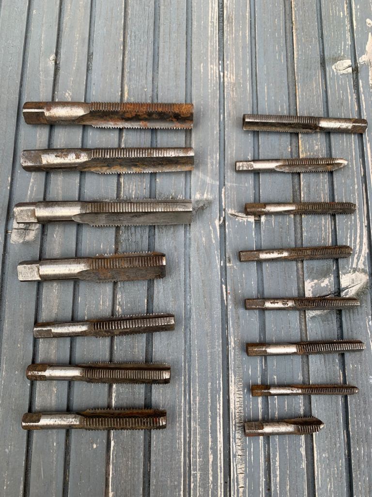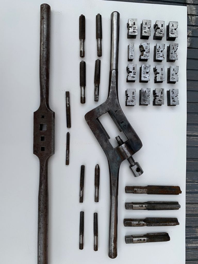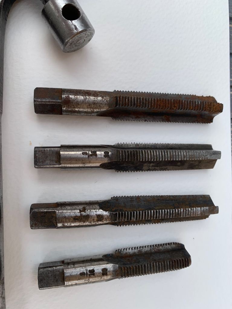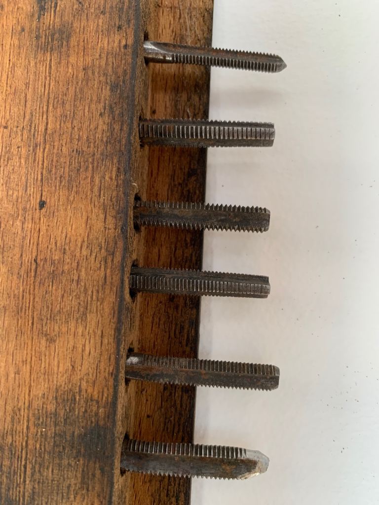 Vintage Tap and Die set in its own wooden box. Possibly by Presto. BSW Imperial sizes. Last photo are of additional taps. Cash and collection only from Undy, Magor.
