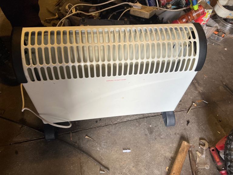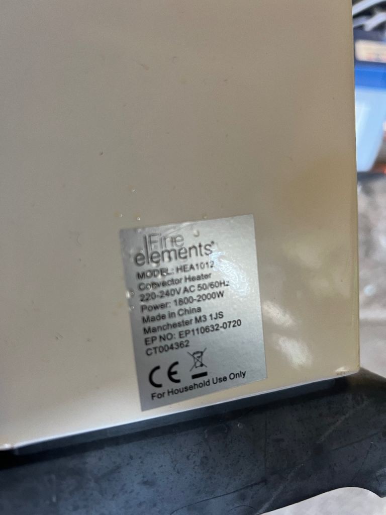 A Fine Elements HEA1012 convector heater with 1800-2000W power. It's suitable for household use and has three power settings: 750W, 1250W, and 2000W. This heater is on wheels for easy movement.use and good collect from